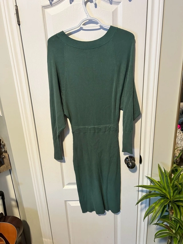 This is a used RW&CO. green, size XXS knit dress in good condition. It features long sleeves and a comfortable knit material, perfect for casual or semi-formal occasions. Brand: RW&CO. Size: XXS Colour: Green Sleeve Length: Long Sleeve. If the ad is still up, it's still available!