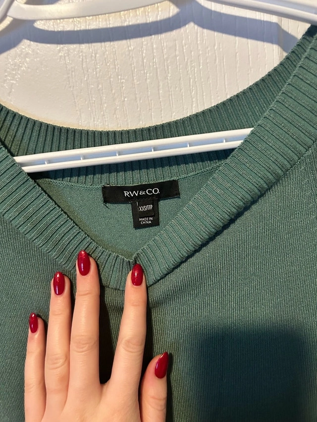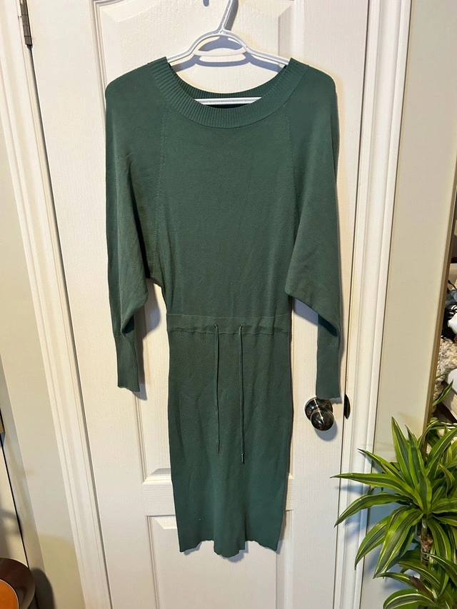This is a used RW&CO. green, size XXS knit dress in good condition. It features long sleeves and a comfortable knit material, perfect for casual or semi-formal occasions. Brand: RW&CO. Size: XXS Colour: Green Sleeve Length: Long Sleeve. If the ad is still up, it's still available!