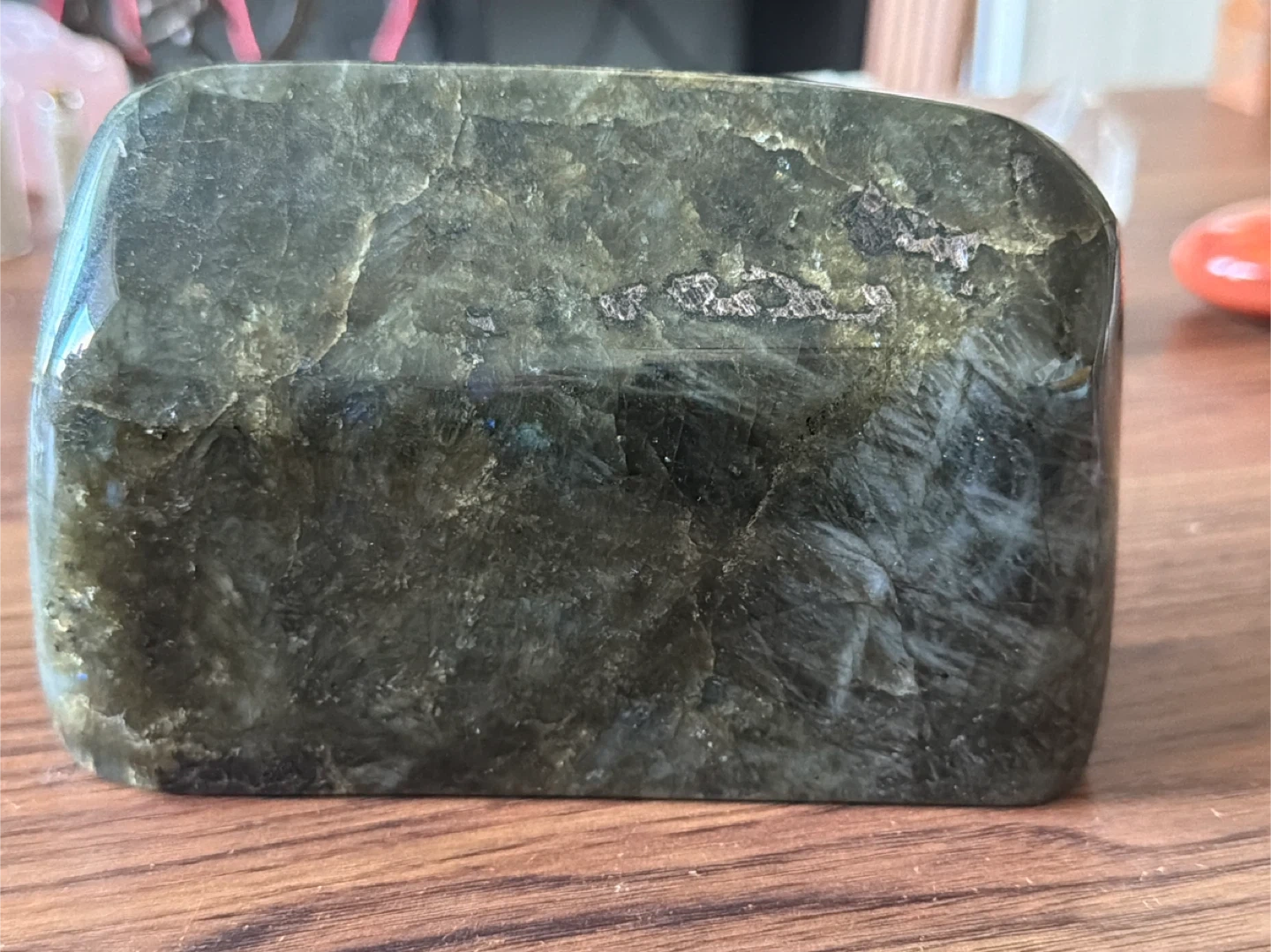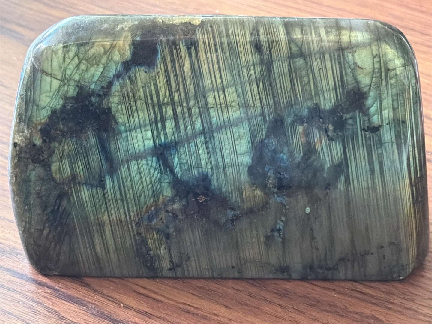 Polished labradorite stone block displaying iridescent blue and green flashes. Its unique parallel striations and beautiful sheen make it a striking decorative piece. This natural mineral specimen offers a captivating display of light and colour.