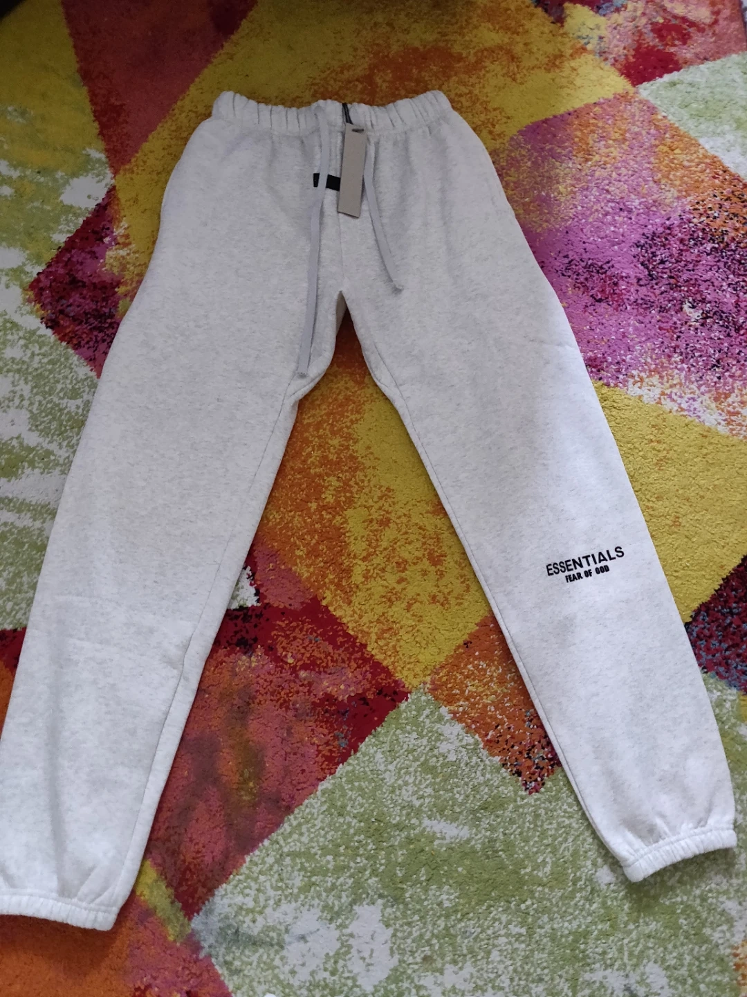 Selling a pair of Essentials Fear of God sweatpants! They're a size medium and in great condition. Brand New never been used. The colour is a light grey, and they have the Essentials logo on the leg. Perfect for lounging or running errands!