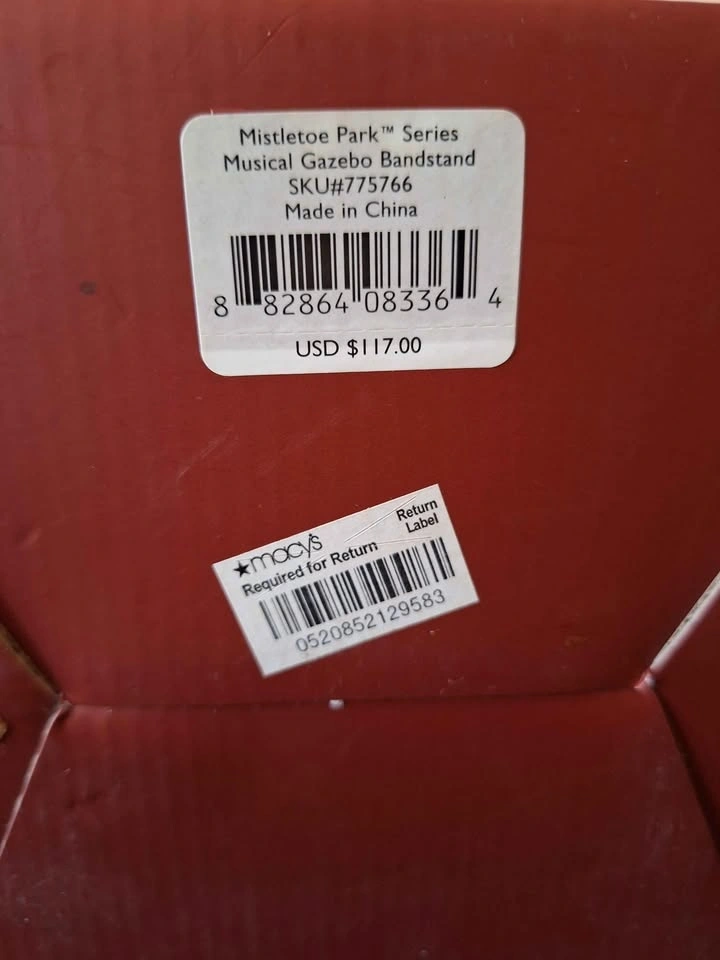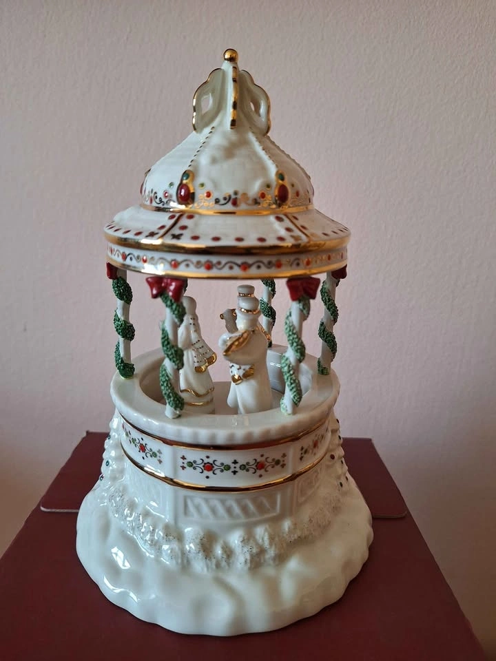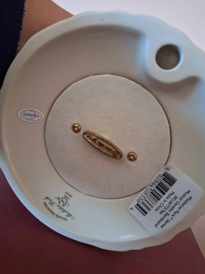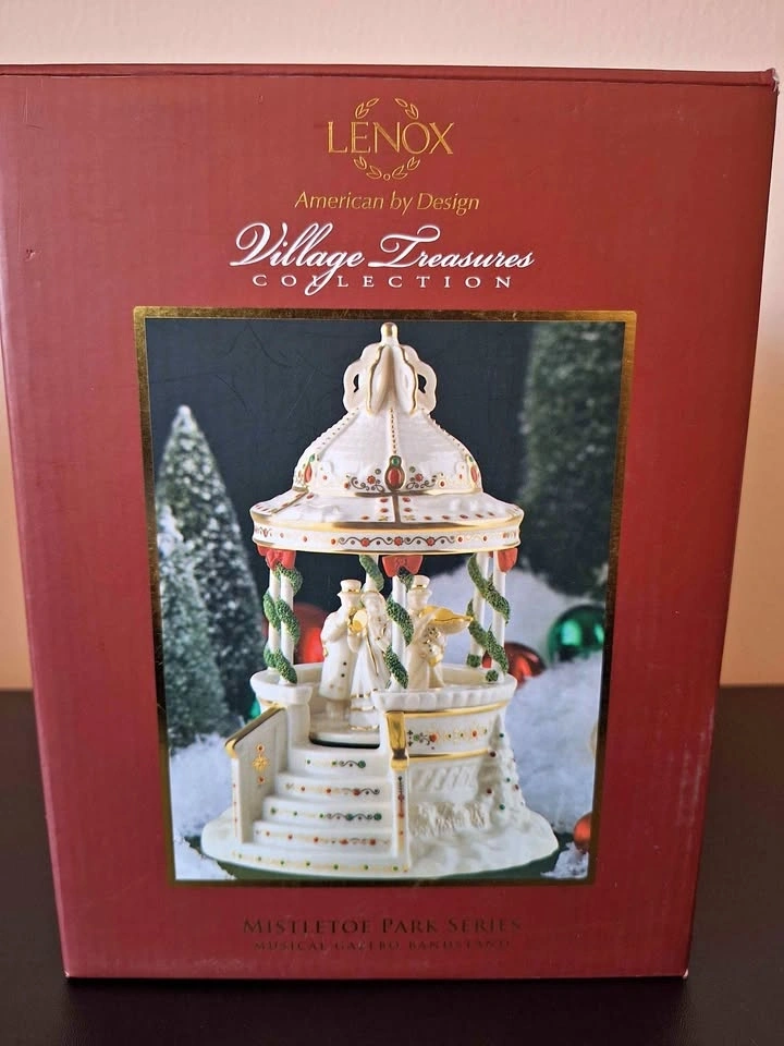 The Lenox Mistletoe Park Series ~MUSICAL GAZEBO BANDSTAND~ Village Treasures is a beautifully crafted porcelain figurine featuring a musical gazebo bandstand scene from the Mistletoe Park collection. The festive winter-themed piece is perfect for collectors and those looking to add a touch of Christmas cheer to their village display. Packaged in a box, this figurine is a charming addition to any holiday decor, bringing the magic of music and Christmas traditions to life in a quaint and intricate design. New in original packaging, though the foam cover for the top is missing. It will be packed well.