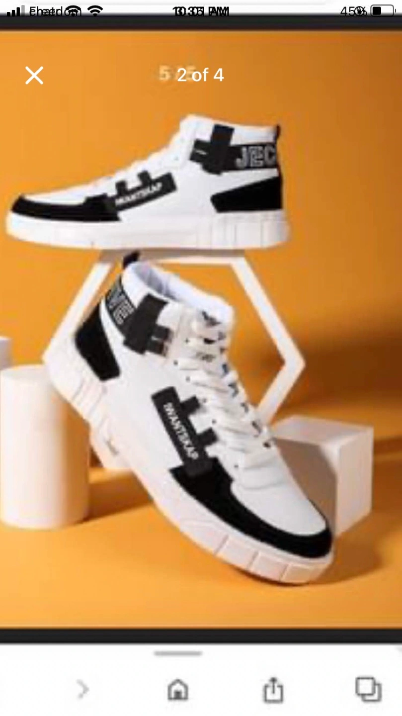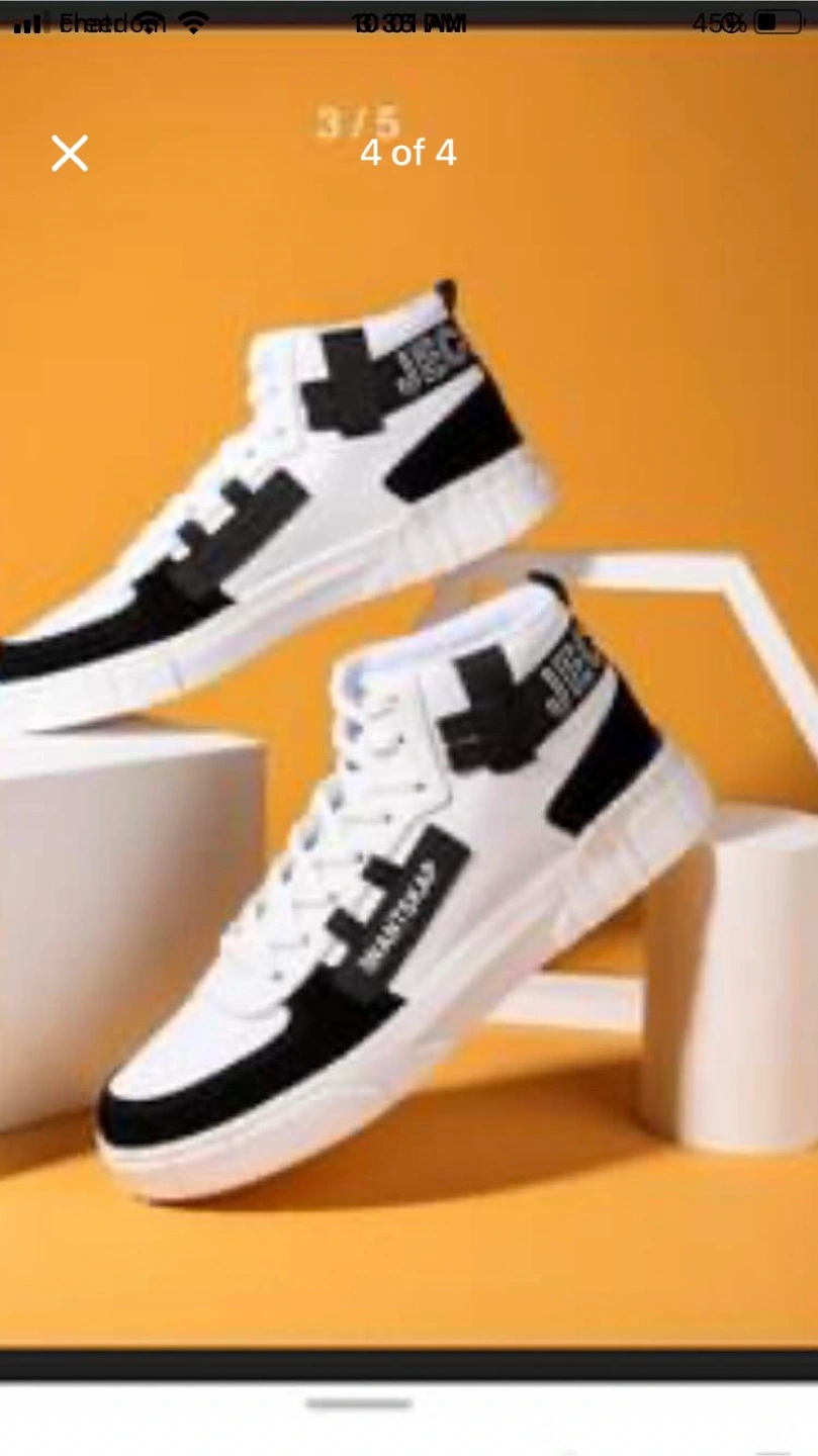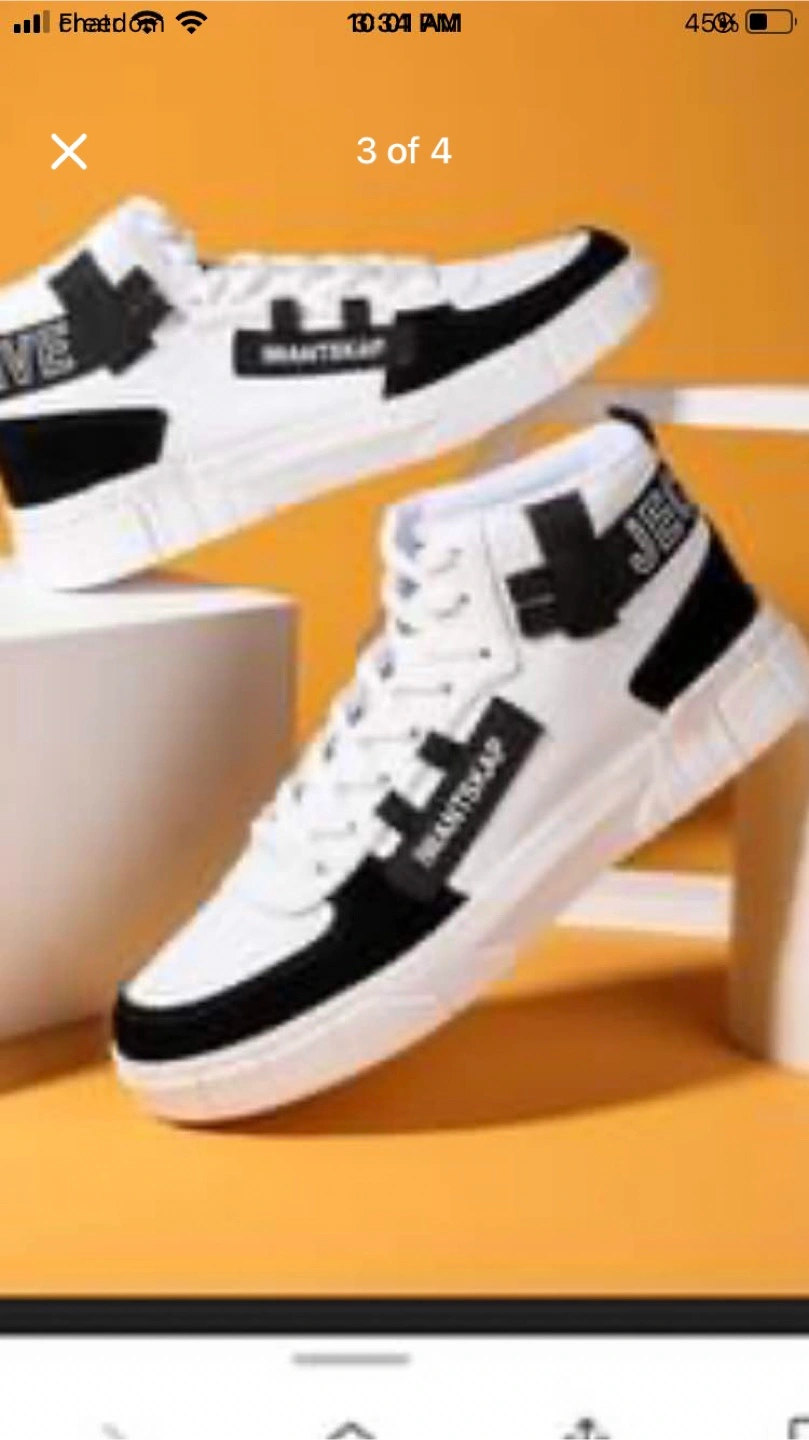 White sneakers with black accents. Features a lace-up closure. The shoes have a high-top design. Imagine how nice you will feel with these on your feet.