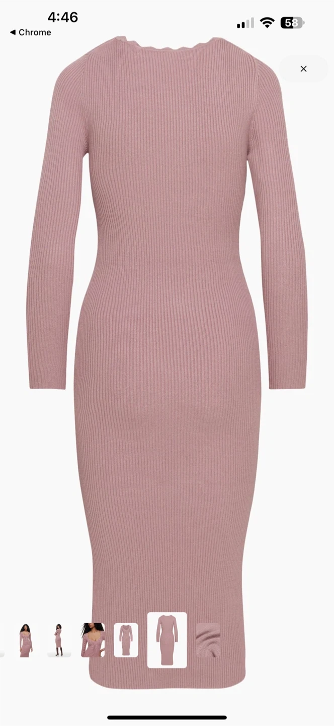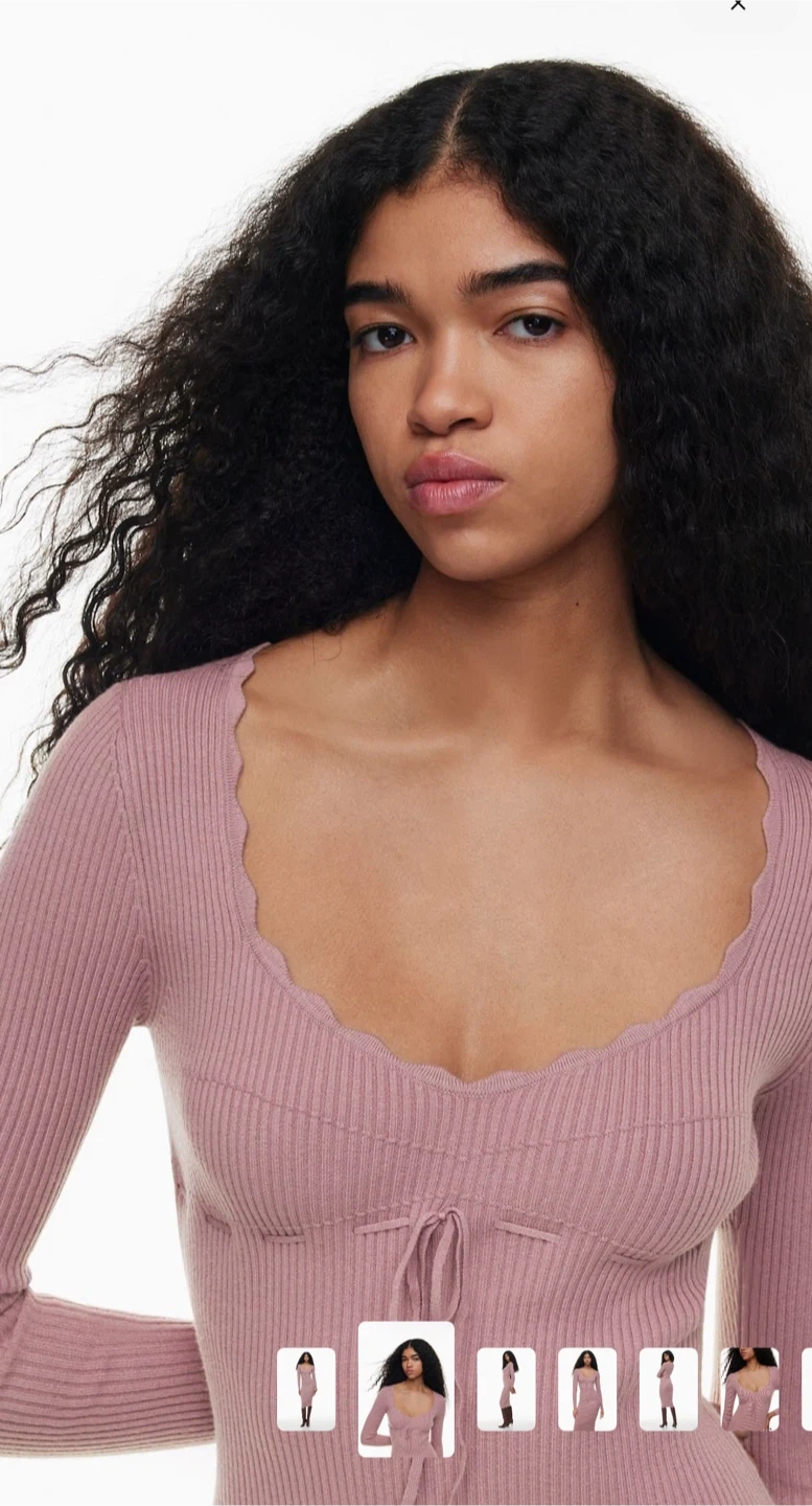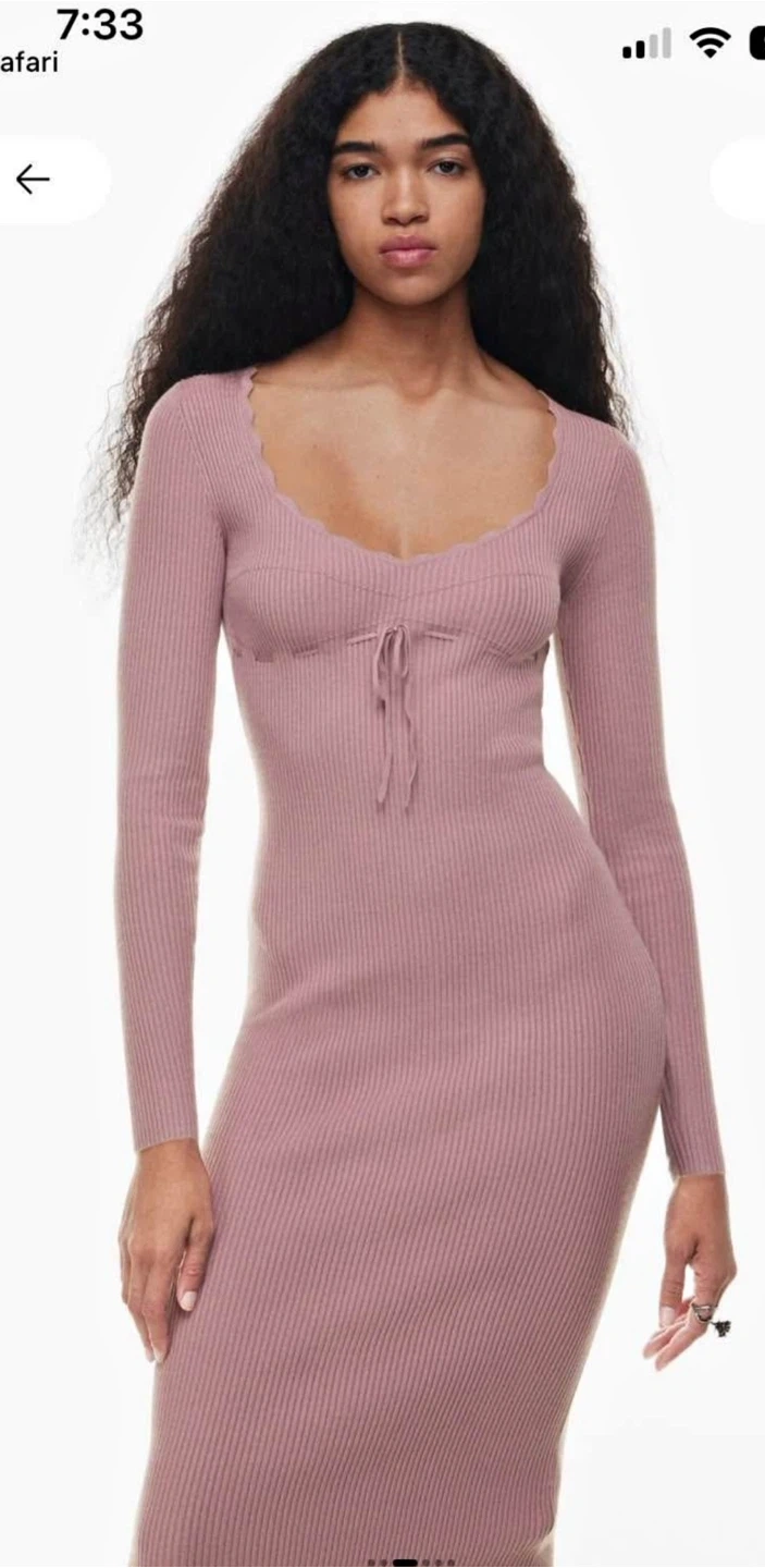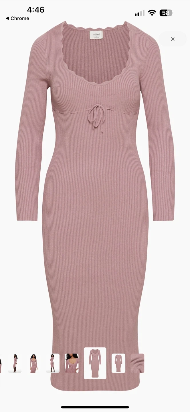 This Wilfred dress is a ribbed knit style with long sleeves and a tie-front detail at the bust. It features a scalloped neckline. Midi length. Perfect for layering or wearing on its own.