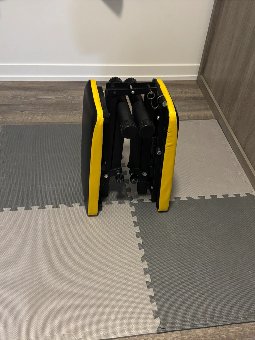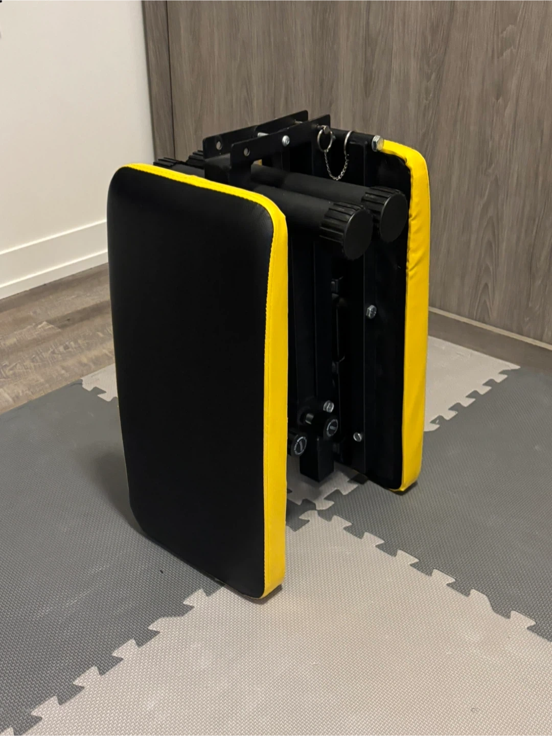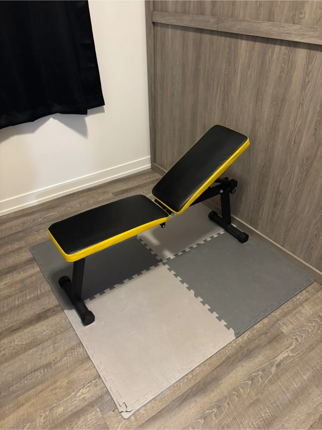 This is a black and yellow adjustable workout bench. It's designed for strength training exercises. This bench can be folded for convenient storage when not in use.