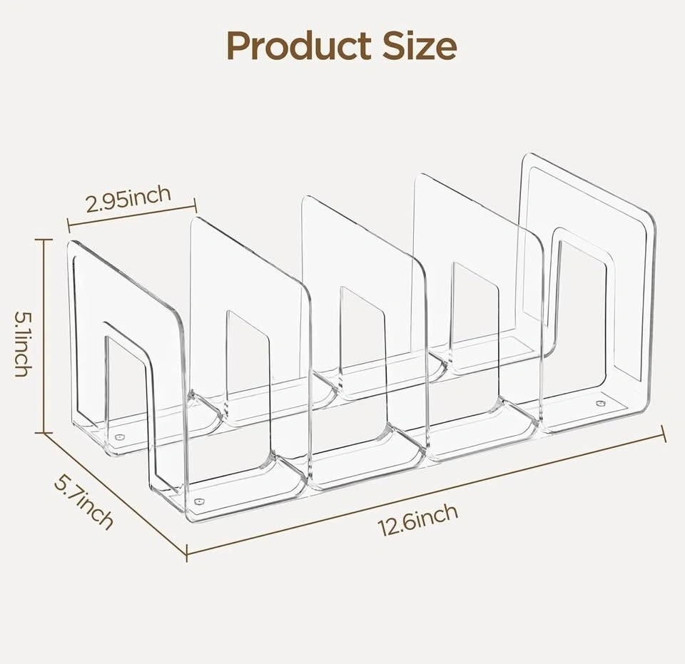 This clear acrylic desktop organizer is perfect for keeping your books and magazines tidy! It can also be used as a handbag or clutch divider. The dimensions are 2.95 inches x 5.1 inches x 5.7 inches x 12.6 inches. Comes in the original box!