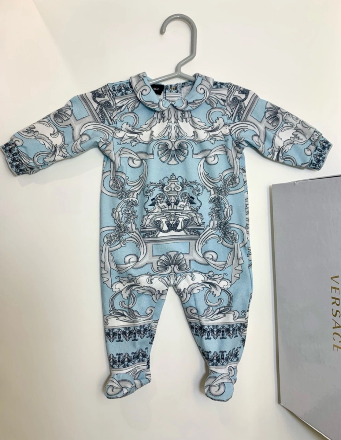 Versace soft cotton blue onesie with signature silver baroque print detailing.