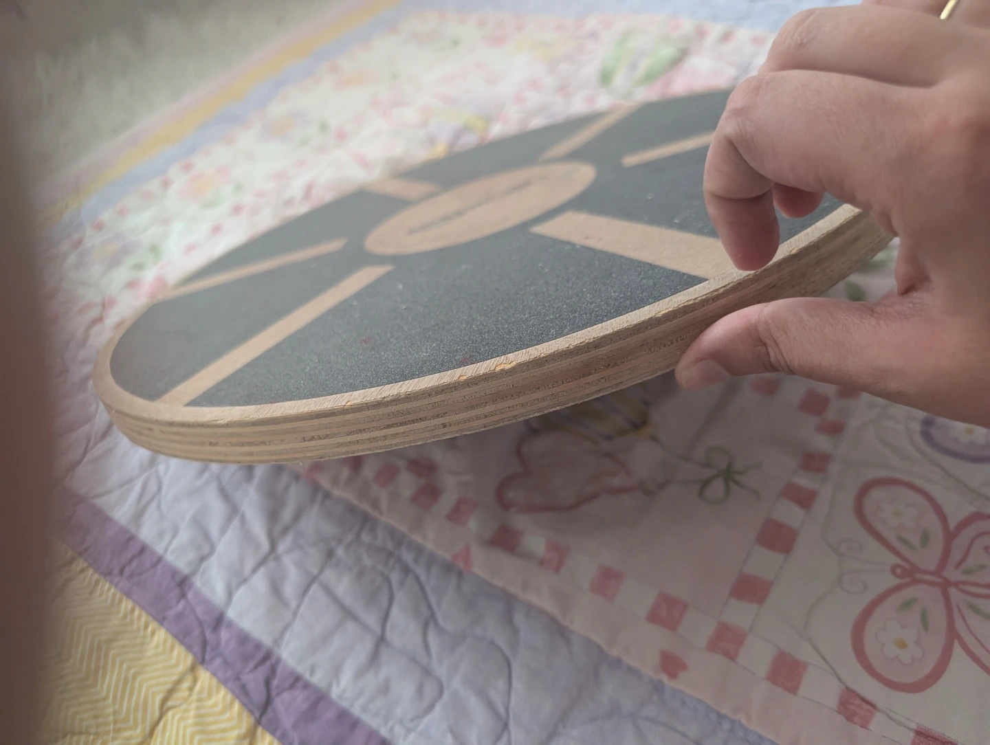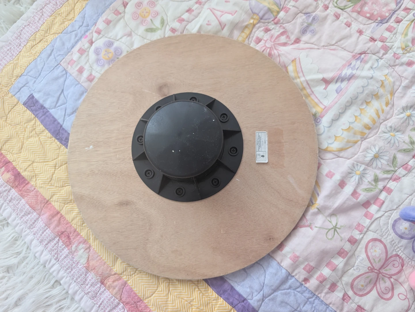 Wooden balance board with a textured top surface for grip. It has a black rotating base for dynamic movement. Great for improving core strength and balance!