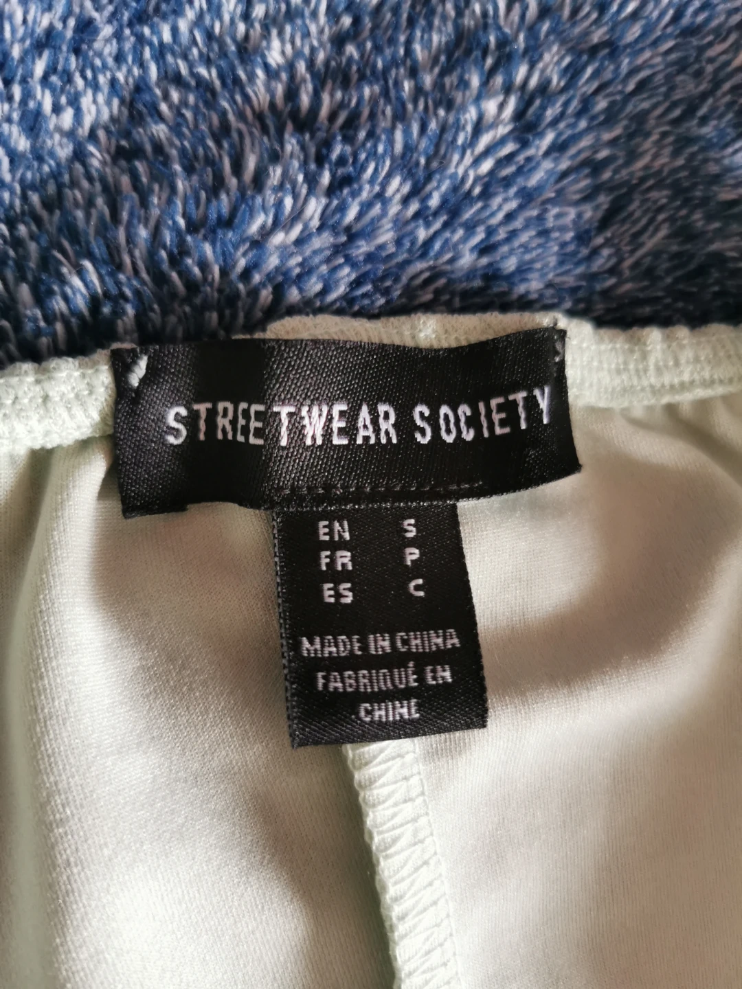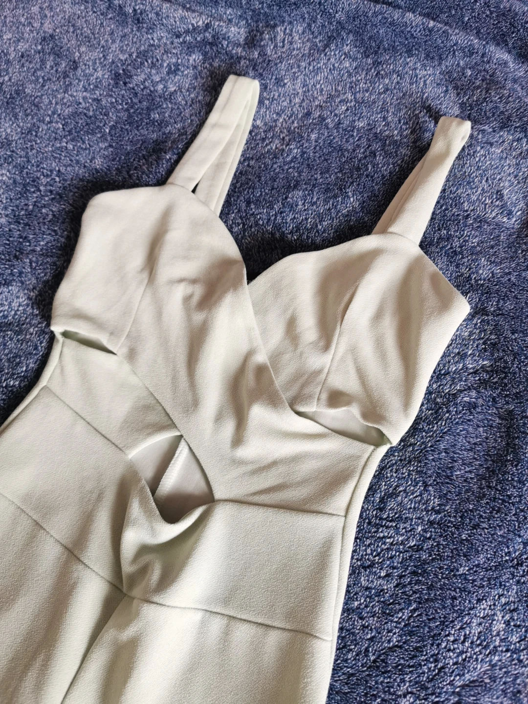 This light mint green jumpsuit is from Streetwear Society. It features a flattering V-neckline with cut-out details. Size is small.