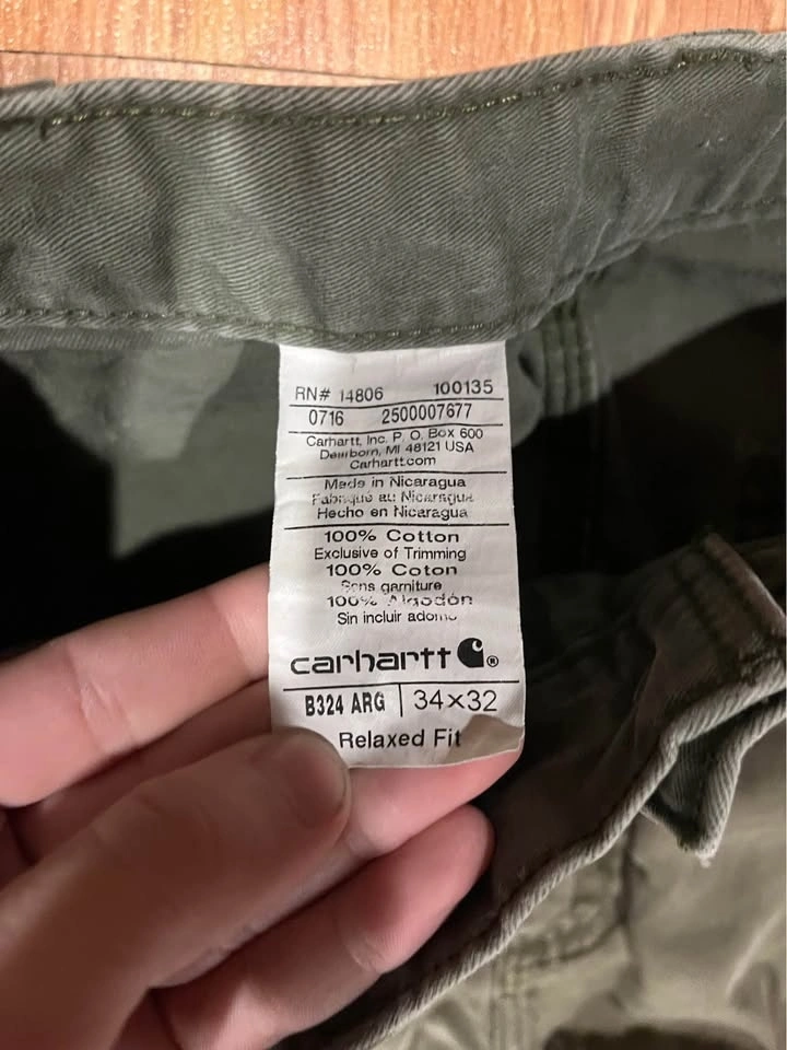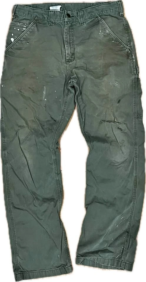 Rugged Carhartt B324 ARG Relaxed Fit work pants in army green, size 34x32. Made from 100% cotton. They have a worn-in look with a small rip on the knee and some paint splatters, perfect for work or casual wear. Primary pickup at Tim Hortons – 18682 Fraser Hwy #401. Open to offers!