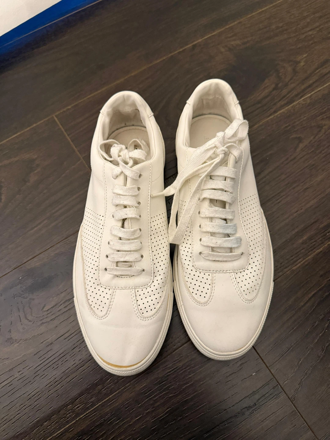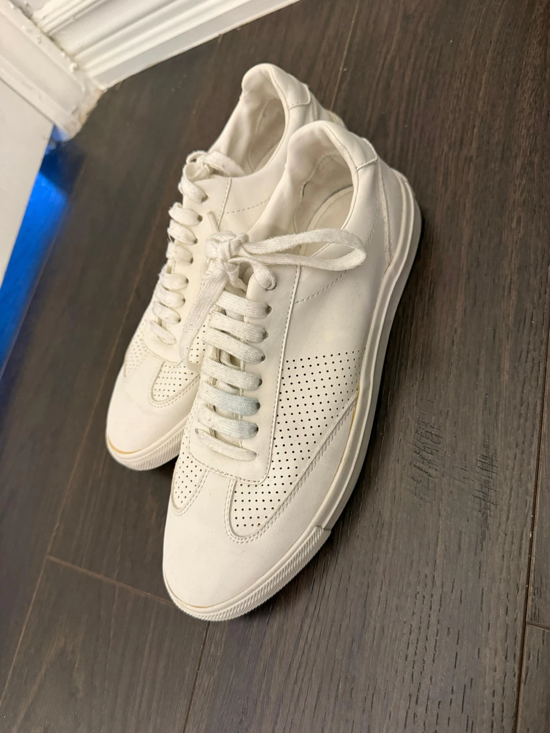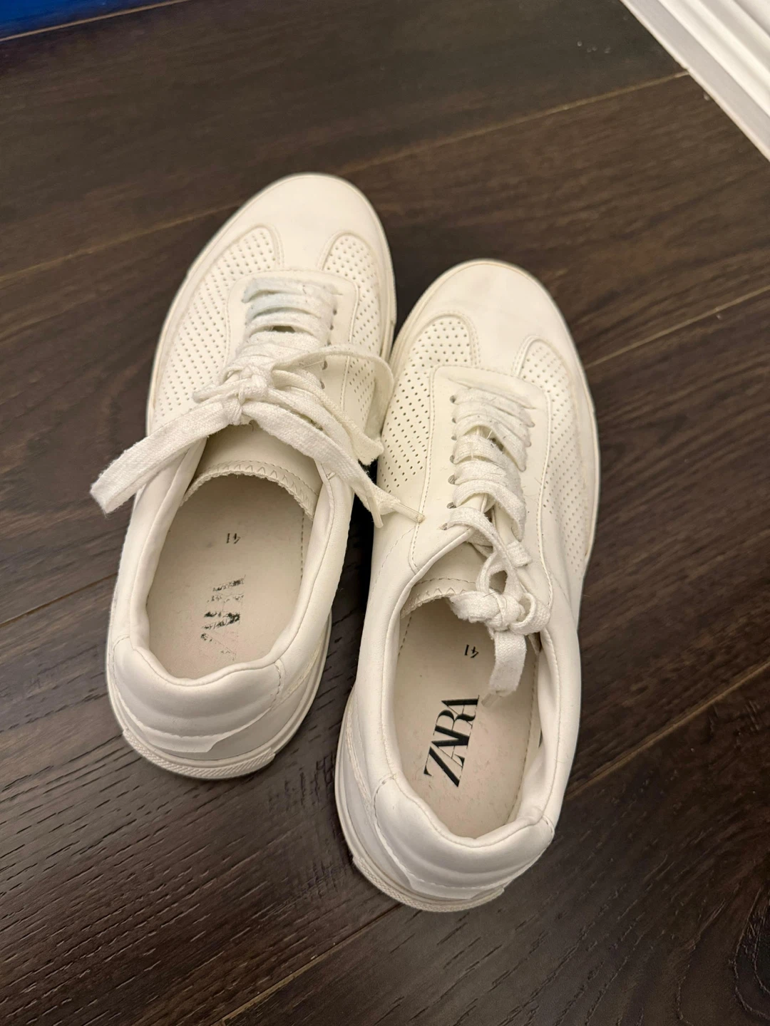 These are white leather sneakers from ZARA. They're designed with perforated details on the toe box and sides. The size is 41. Pick up at either Bathurst and center, or Richmond Hill! Delivery with additional cost.