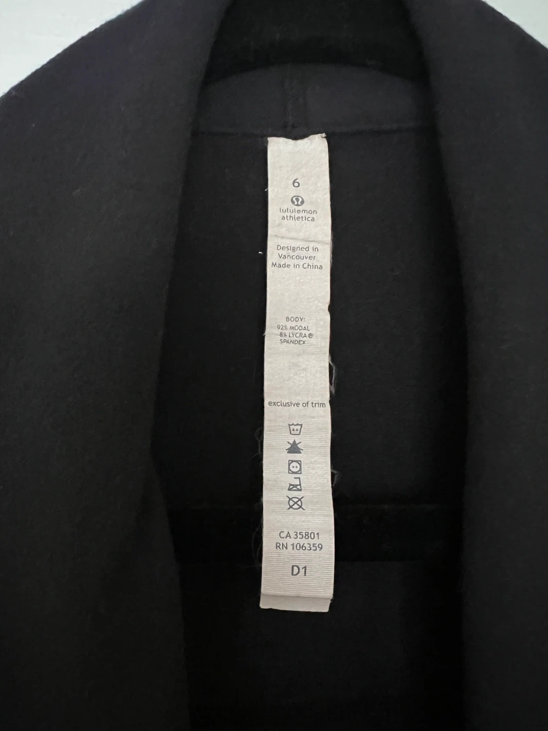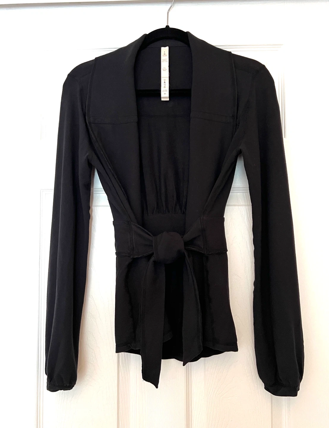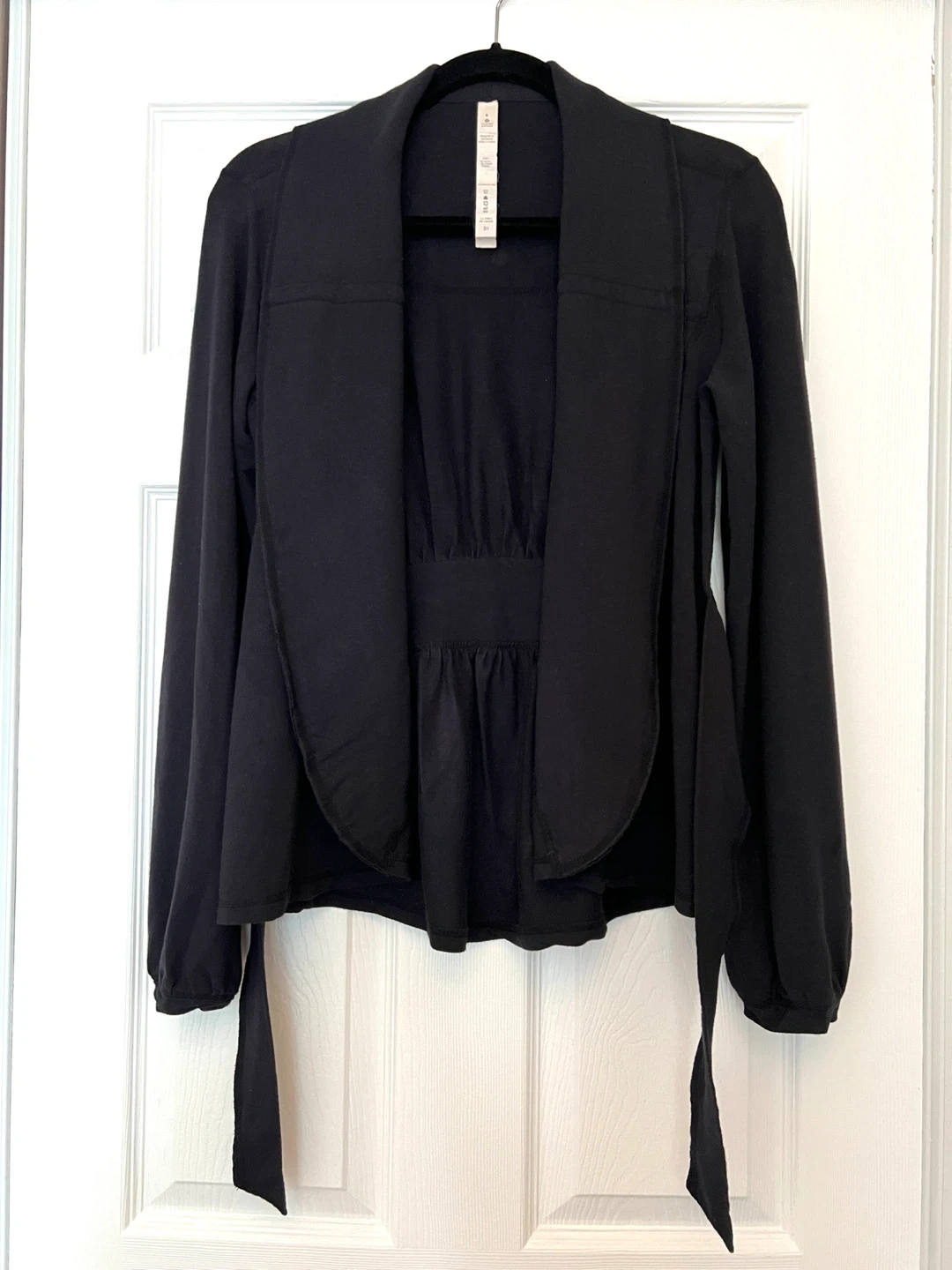 Selling a Lululemon soft black wrap jacket in size 6. It's made of 92% modal and 8% spandex, making it super comfortable. Perfect for layering!