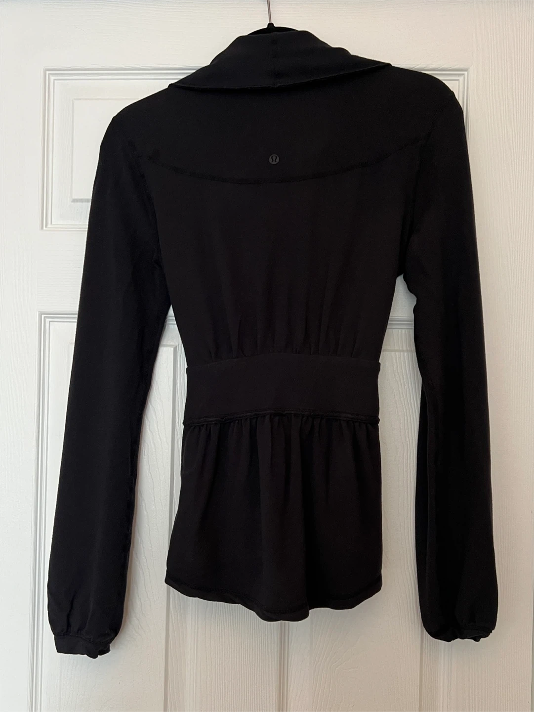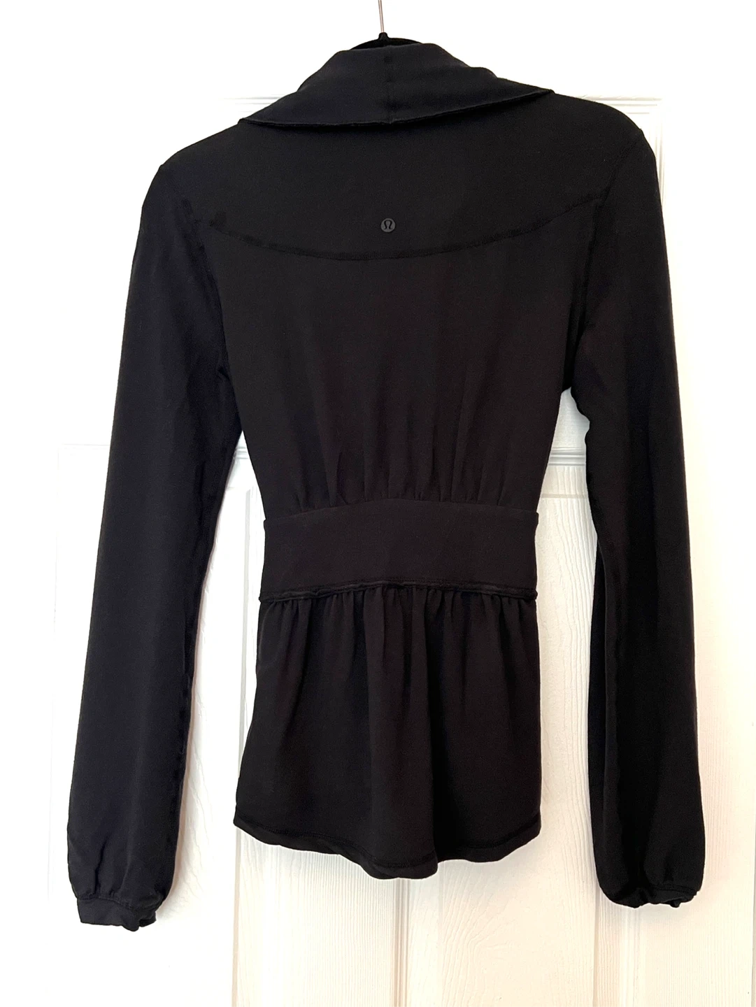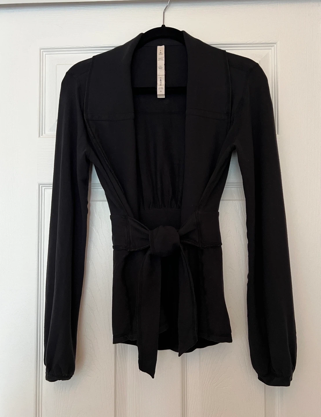 Selling a Lululemon soft black wrap jacket in size 6. It's made of 92% modal and 8% spandex, making it super comfortable. Perfect for layering!