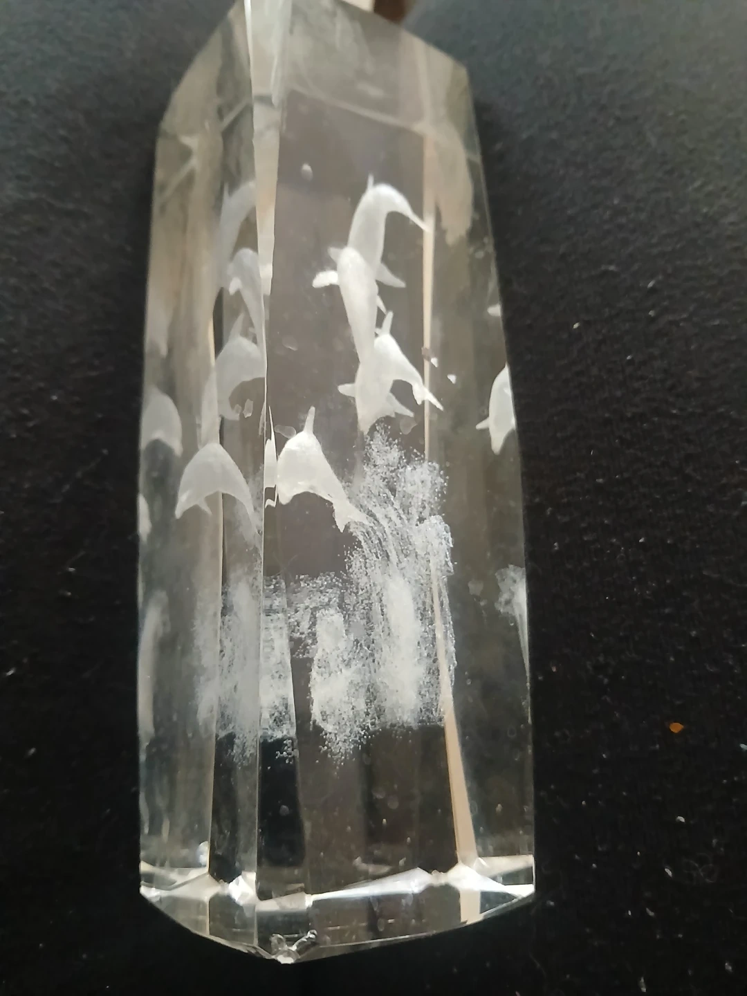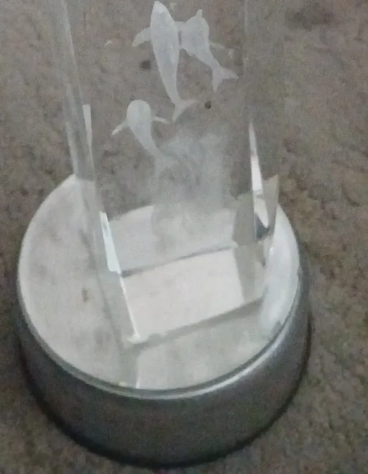 This clear crystal display features etched dolphins in various poses. It sits on a round, light-up base that illuminates the etched design. It's a nice decorative piece for any room.