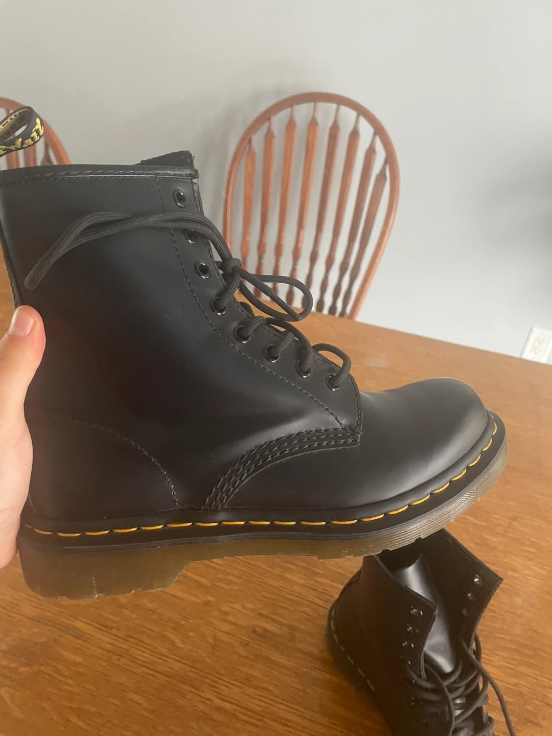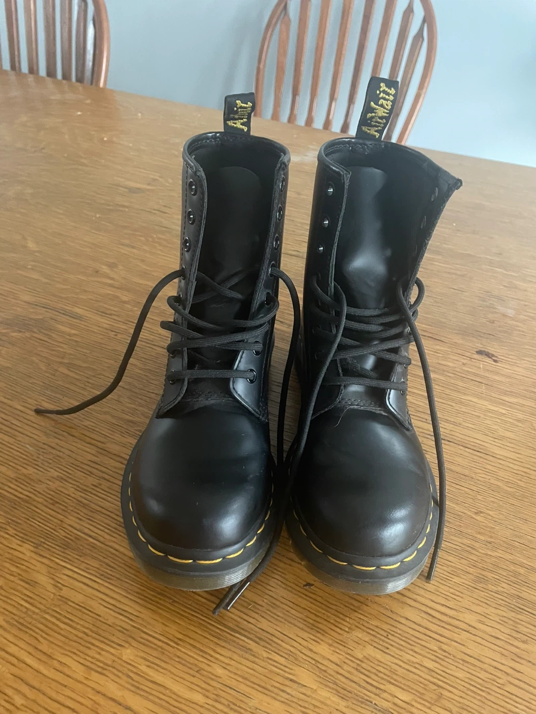Classic Dr. Martens boots in black leather. Pristine condition. Only worn once in the summer weather. No rain damage or snow damage.