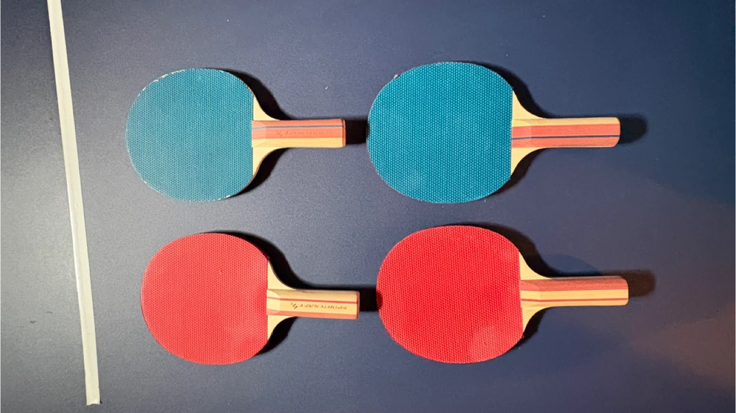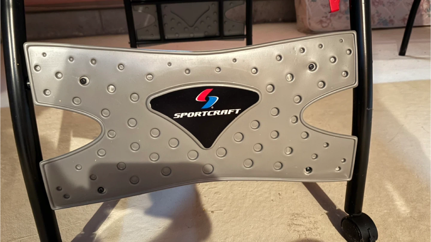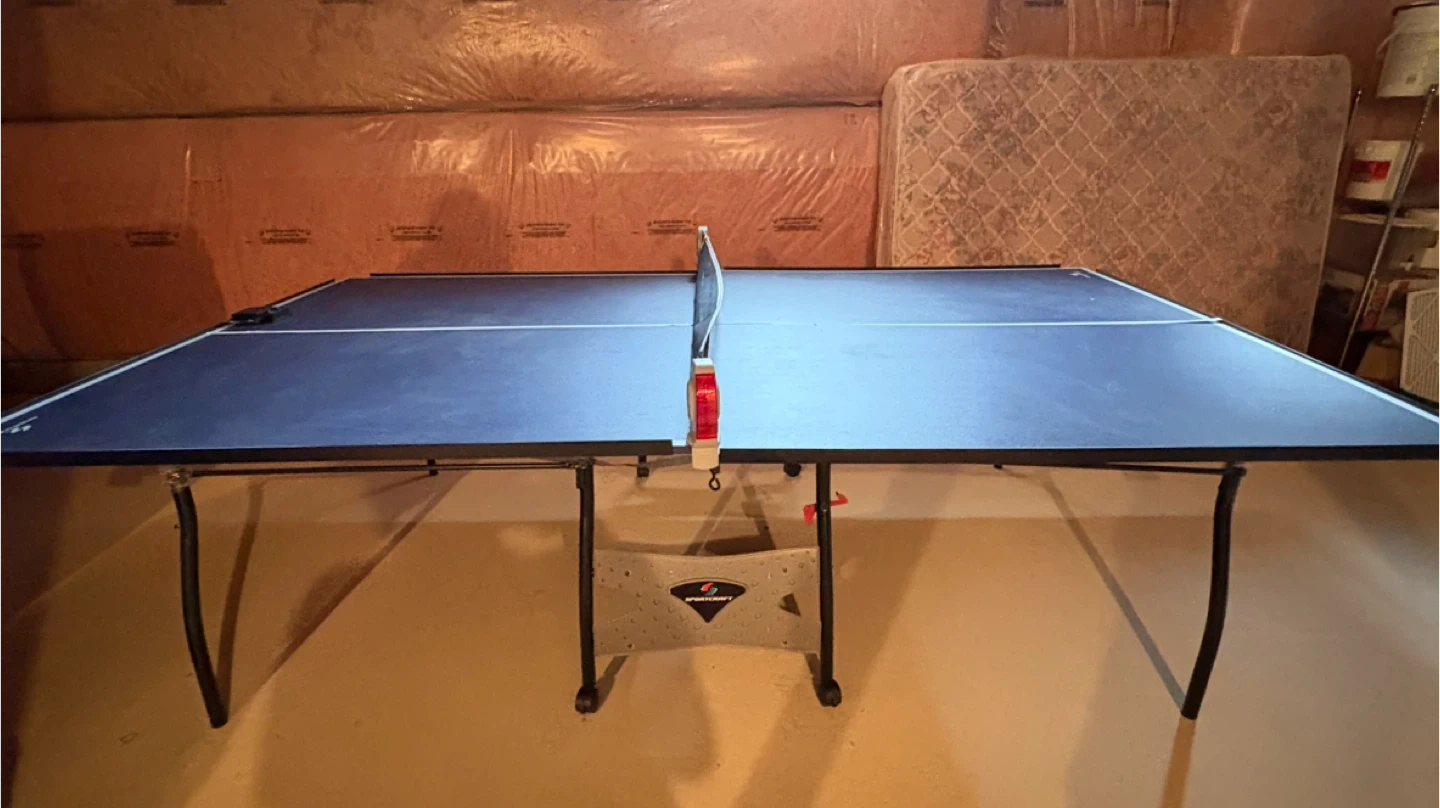 Sportcraft foldable ping pong table. It comes with a net and a scorekeeper for your games. The table is blue with white lines and has a sturdy metal frame.