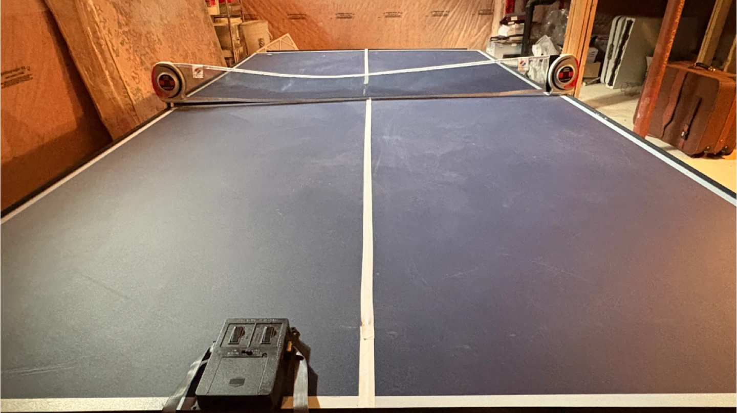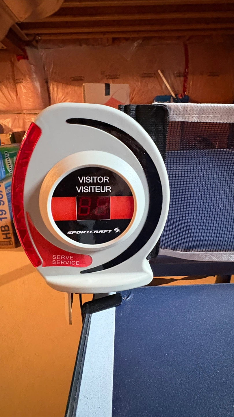 Sportcraft foldable ping pong table. It comes with a net and a scorekeeper for your games. The table is blue with white lines and has a sturdy metal frame.