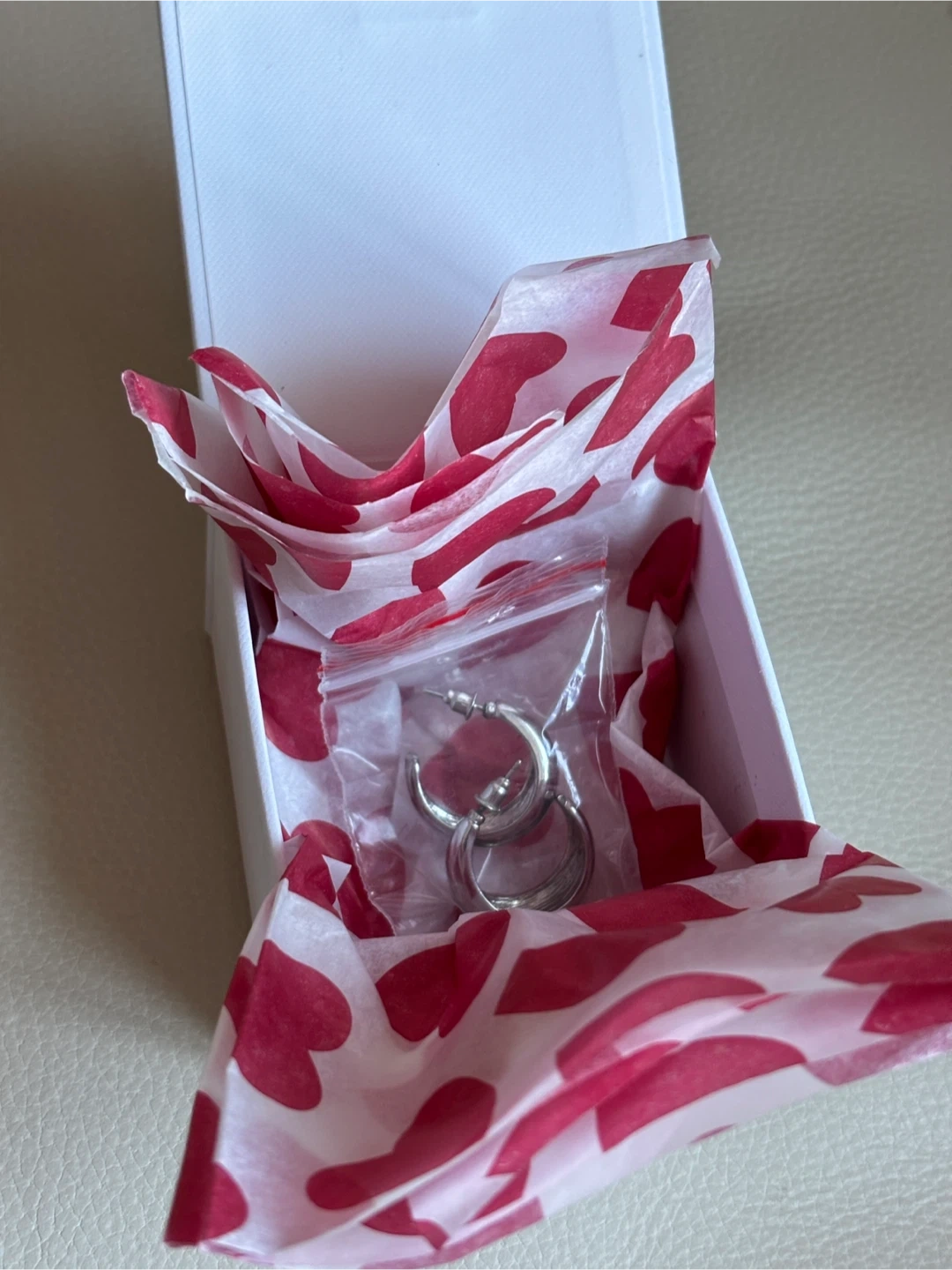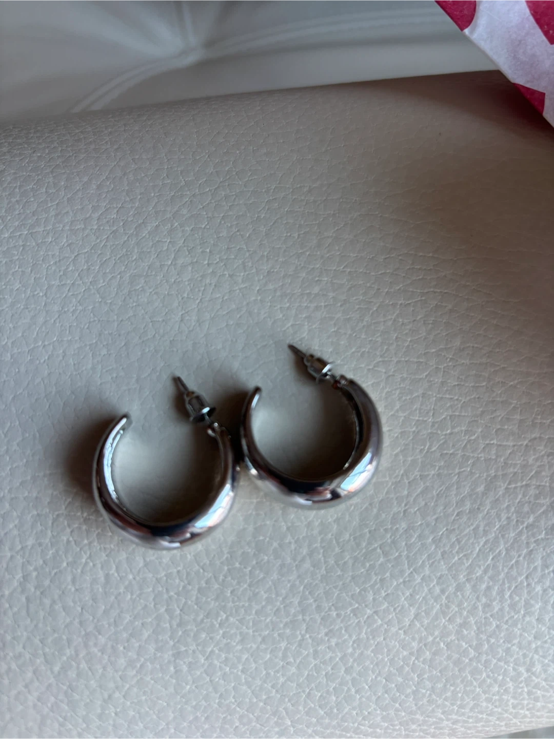 These are a pair of never worn silver (not real) chunky hoop earrings. I have included a Mejuri box and heart tissue. These earrings are a classic accessory for everyday wear. They are not from Mejuri. Only the box is from the brand Mejuri.