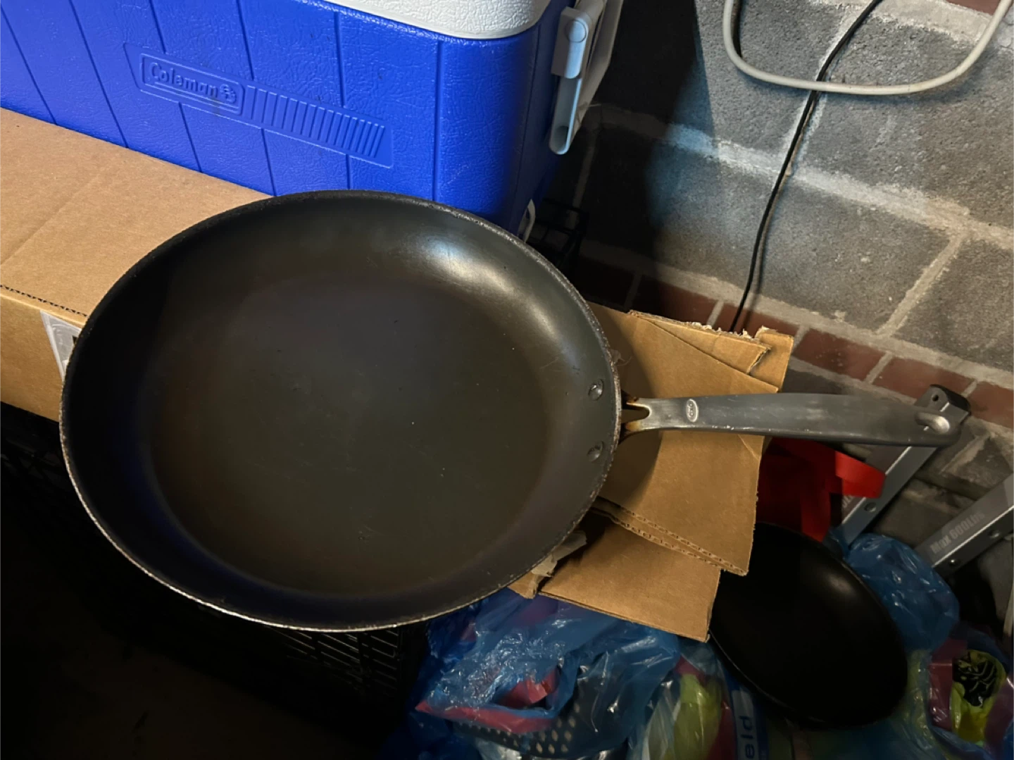 Selling a used black frying pan. It shows signs of wear but is still functional for everyday cooking. Perfect for frying eggs, veggies, or meat!