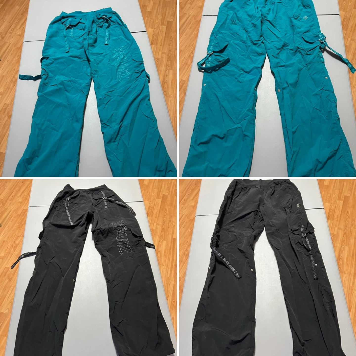 Four pairs of Zumba athletic pants in yellow, dark blue, teal, and black. These pants are designed for dance and workout activities. They feature a comfortable fit and functional pockets. Great for your Zumba classes or any active pursuit! Capris are XXL and Pants are XL