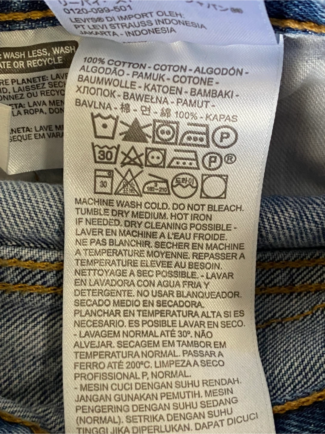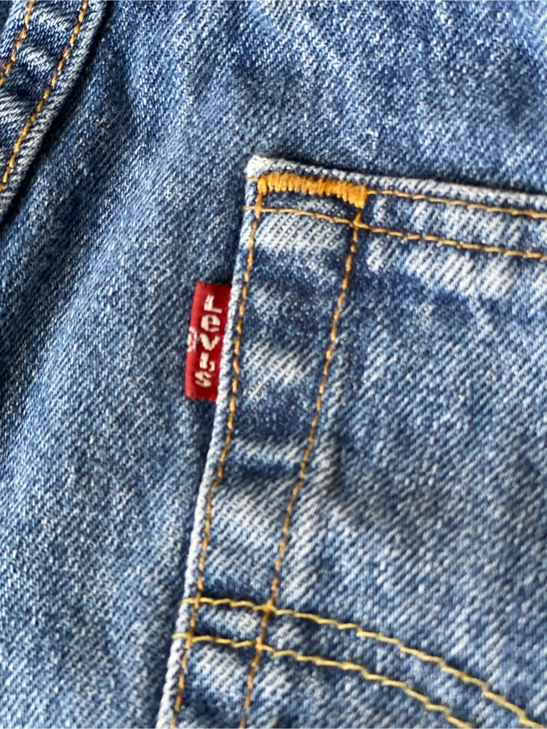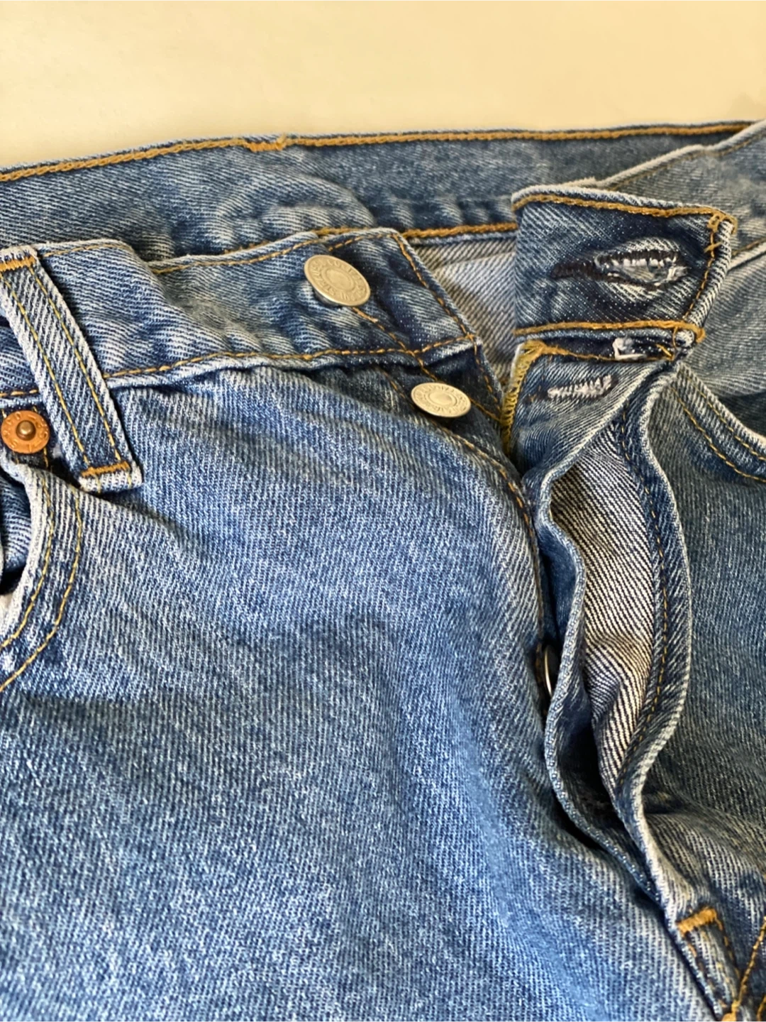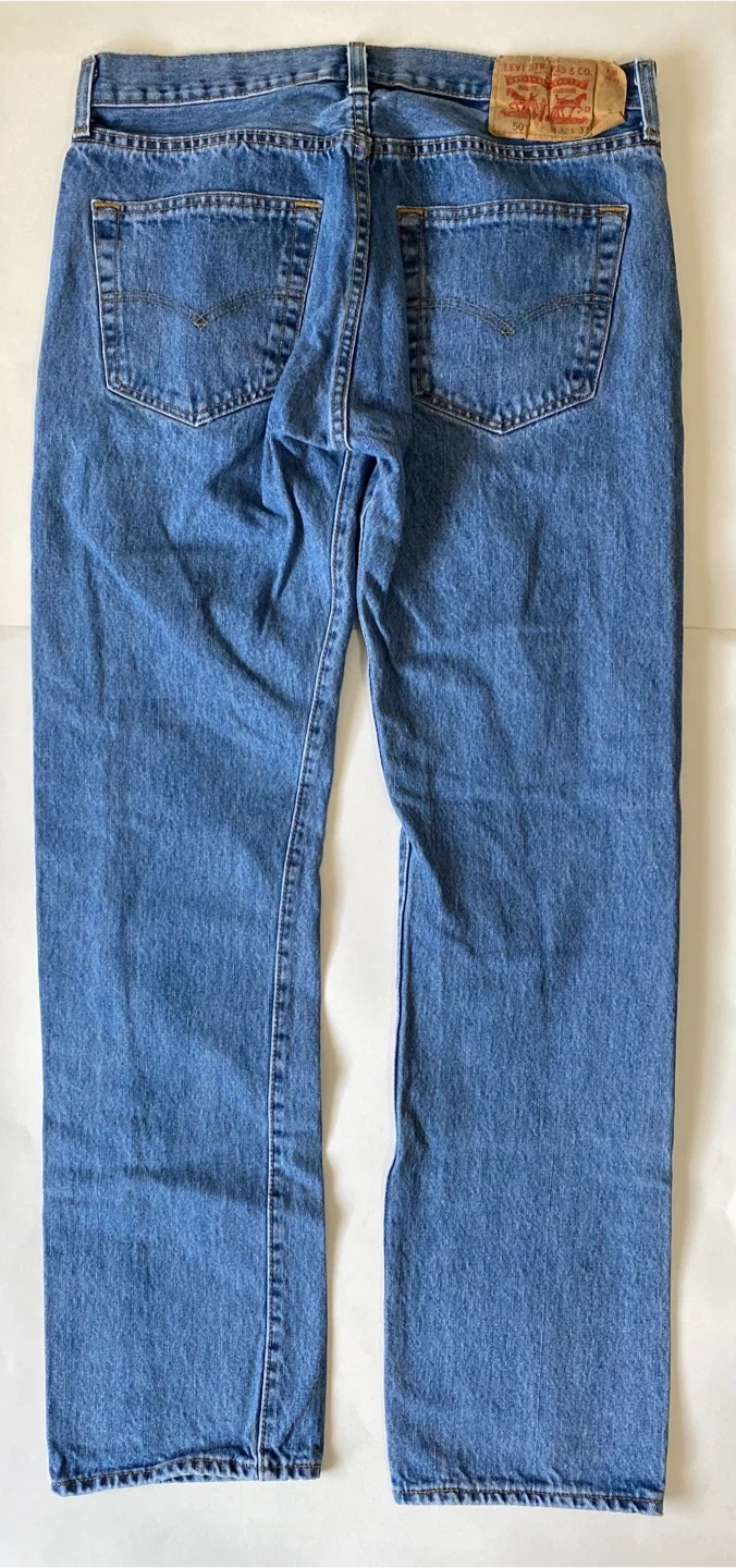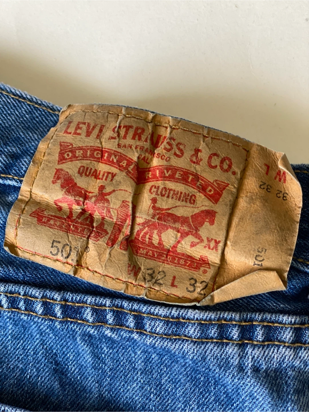 Classic blue denim Levi's 501 jeans. Made of 100% cotton. Waist size 32, inseam 32. Button fly closure.