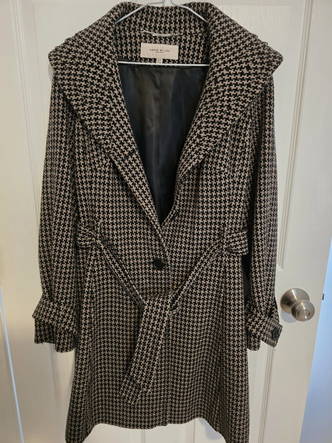 Karen Millen coat with a classic houndstooth-style pattern. It features a tie waist for a defined silhouette and a stylish collar. Size UK 12, US 8, EU 40.
