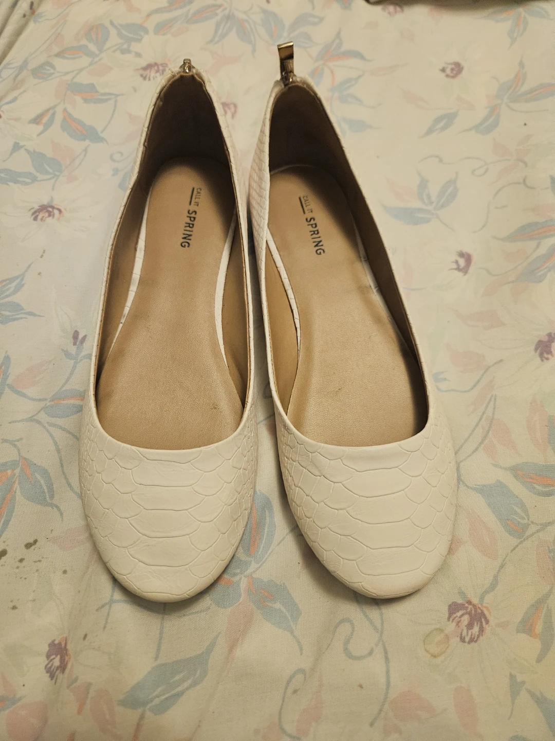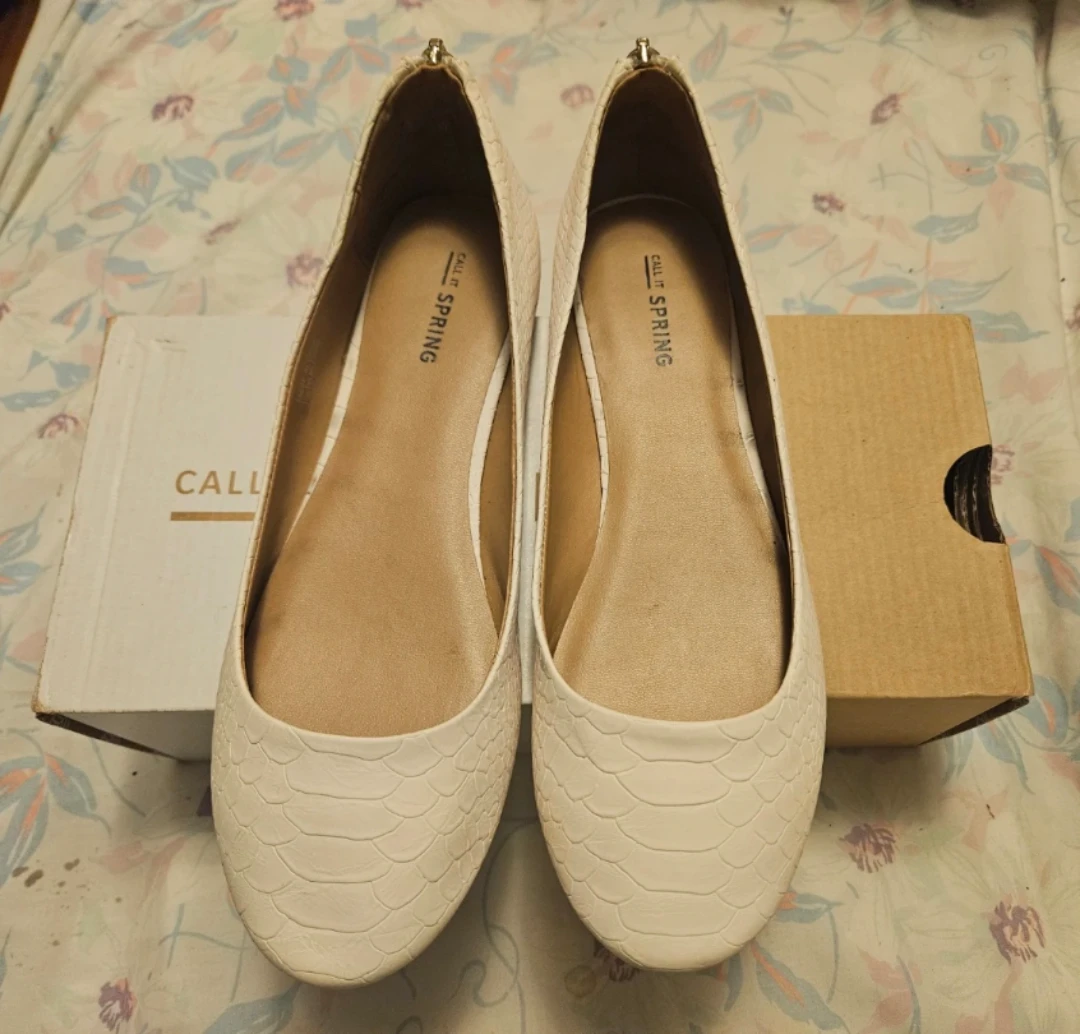 Selling a pair of Call It Spring Brevia flats in a size 7.5. They have a stylish white snakeskin-like texture. The original box is included!
