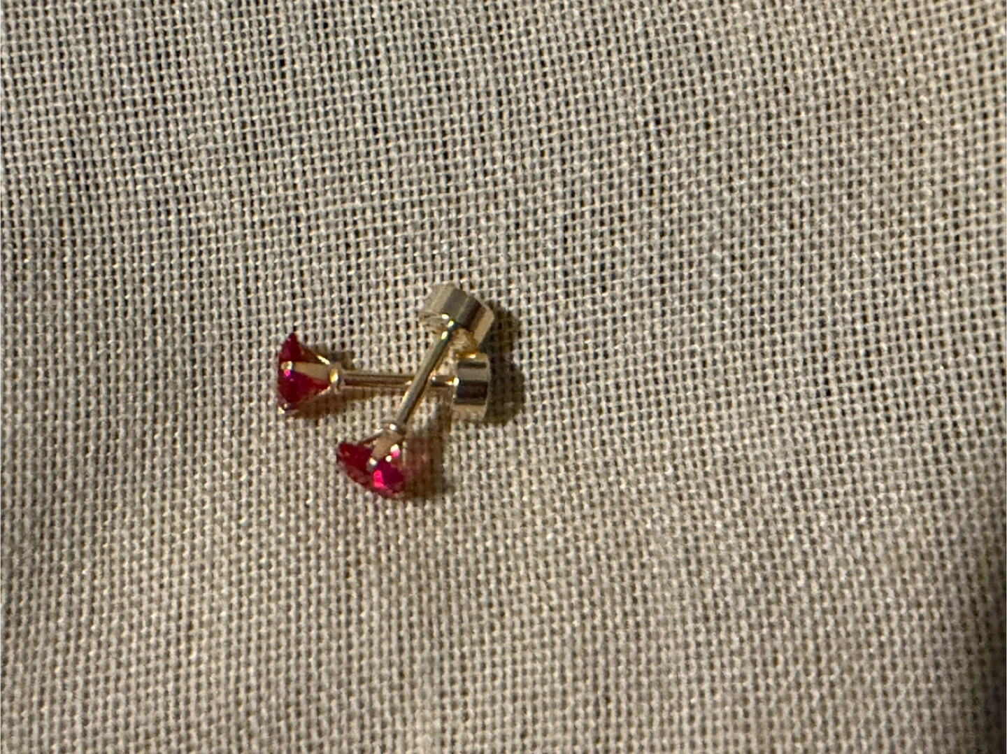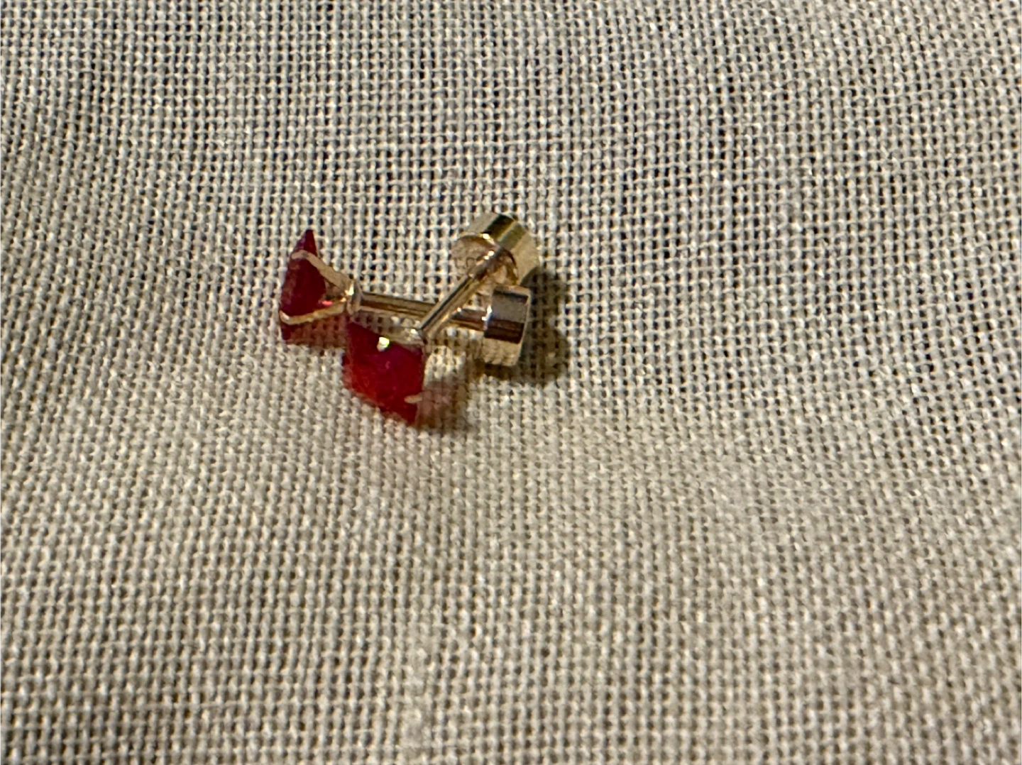 These stud earrings feature gold-tone settings with vibrant red gemstones. They come in a small white plastic holder. They're small and stylish for everyday wear.