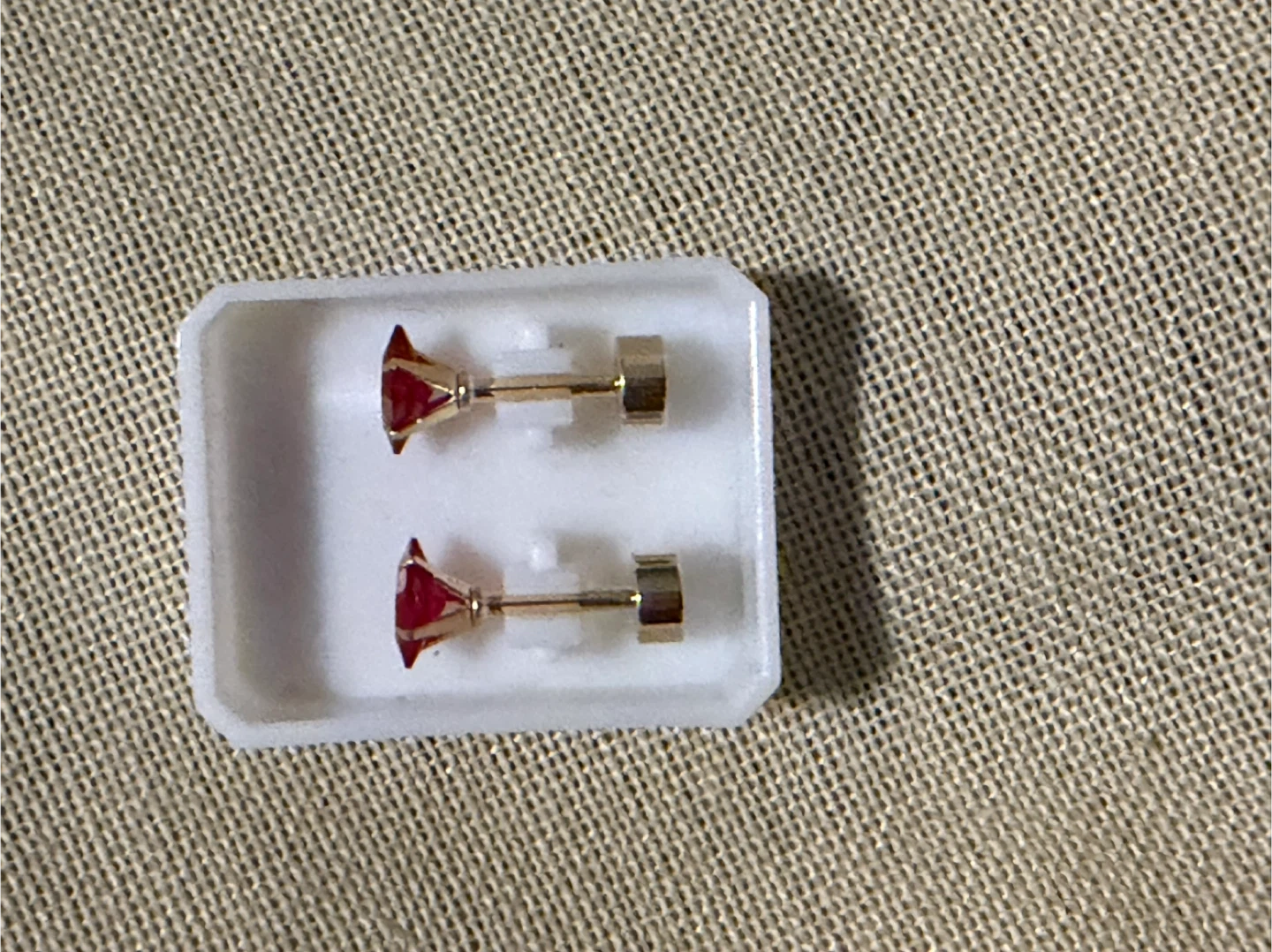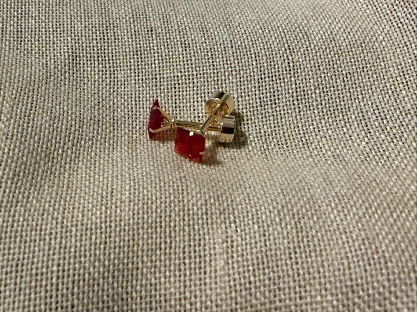 These stud earrings feature gold-tone settings with vibrant red gemstones. They come in a small white plastic holder. They're small and stylish for everyday wear.