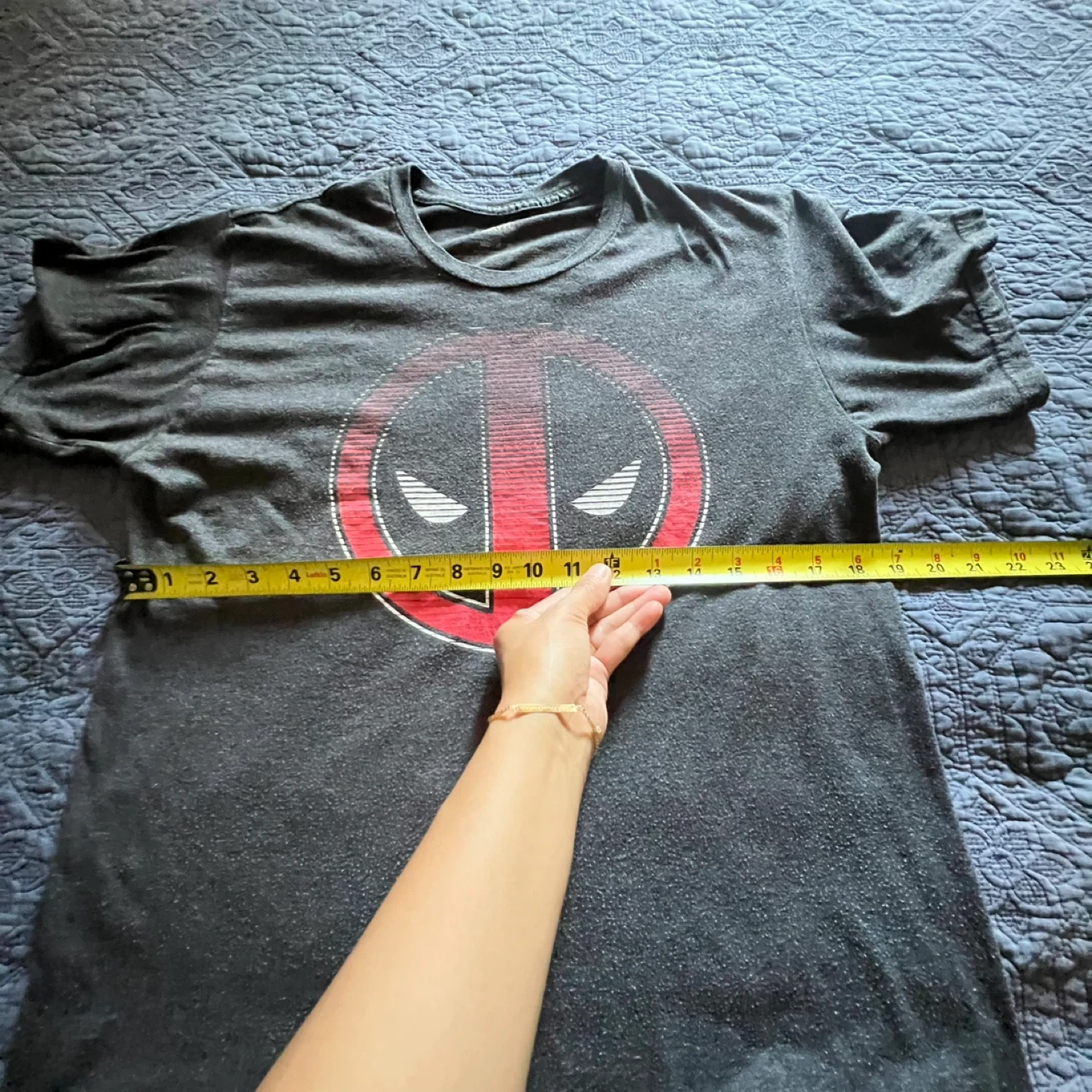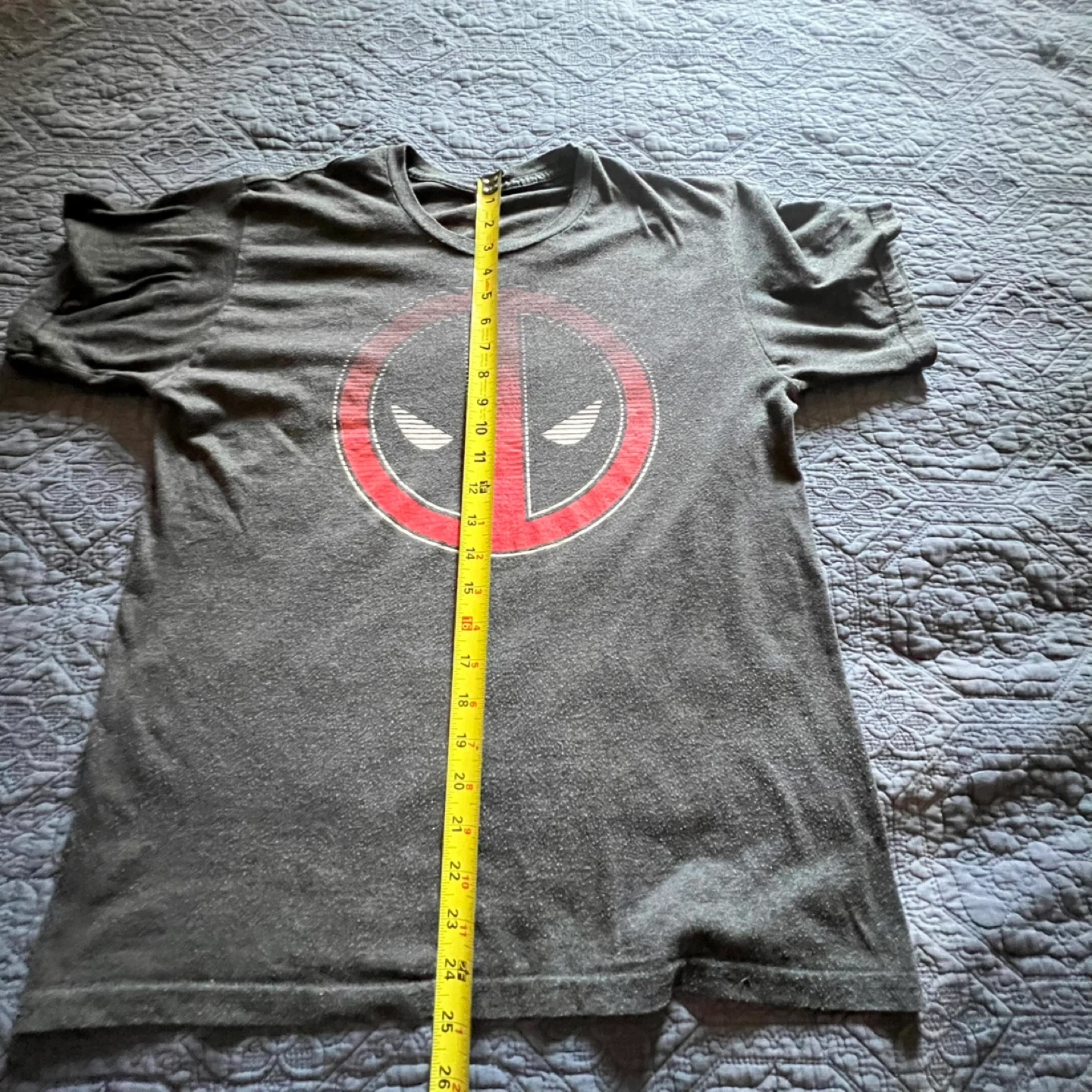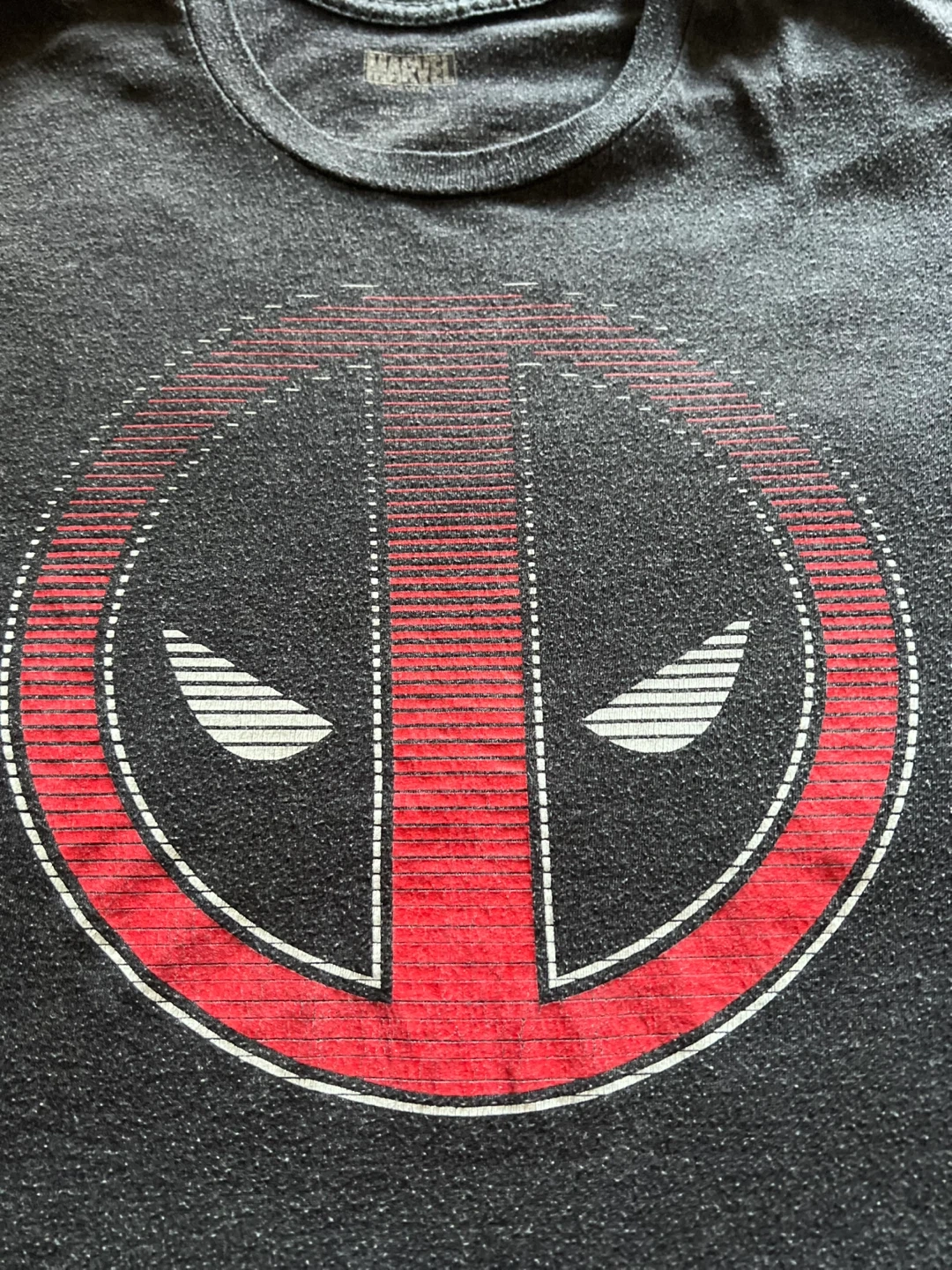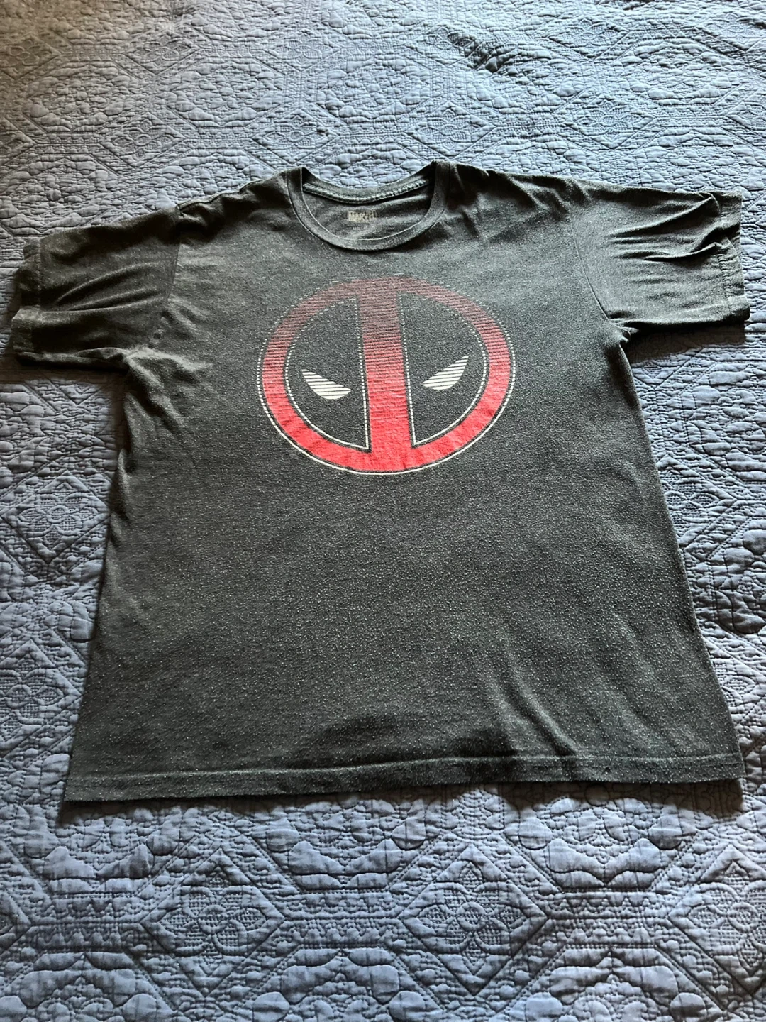 Selling a Marvel Deadpool graphic t-shirt in size medium! It's a heathered grey colour with the Deadpool logo on the front. Great for any Marvel fan!
