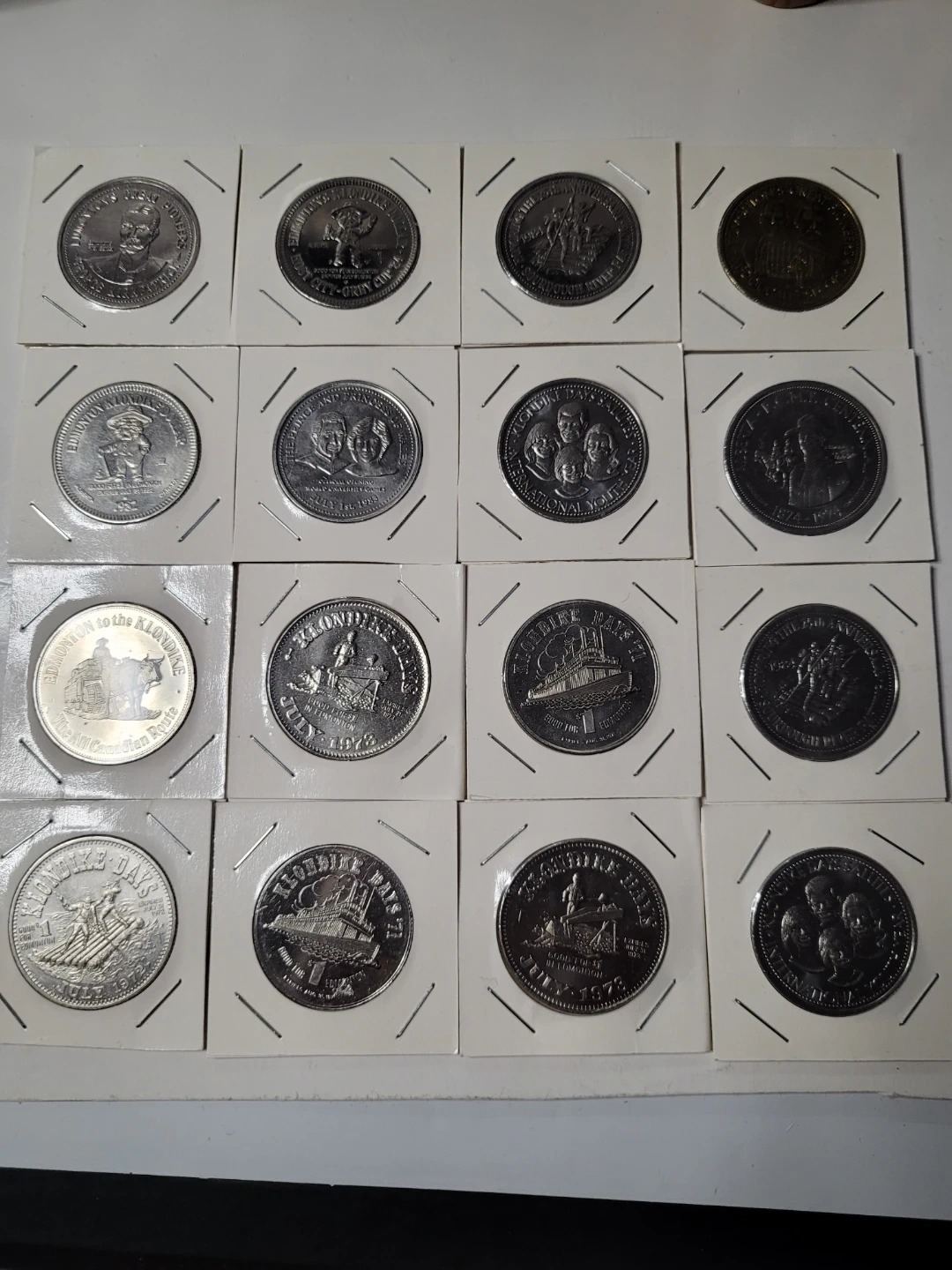 This collection features 16 souvenir coins, many depicting Canadian historical events and locations. Dates visible include July 1978, 1972, and 1874-1944. These coins are a great way to commemorate Canadian heritage.