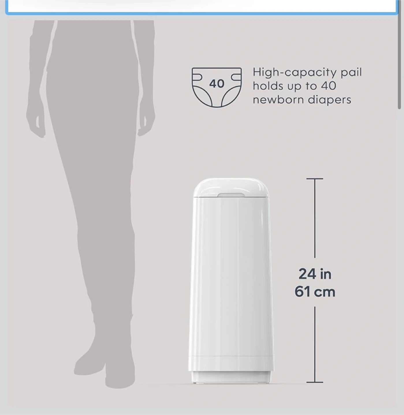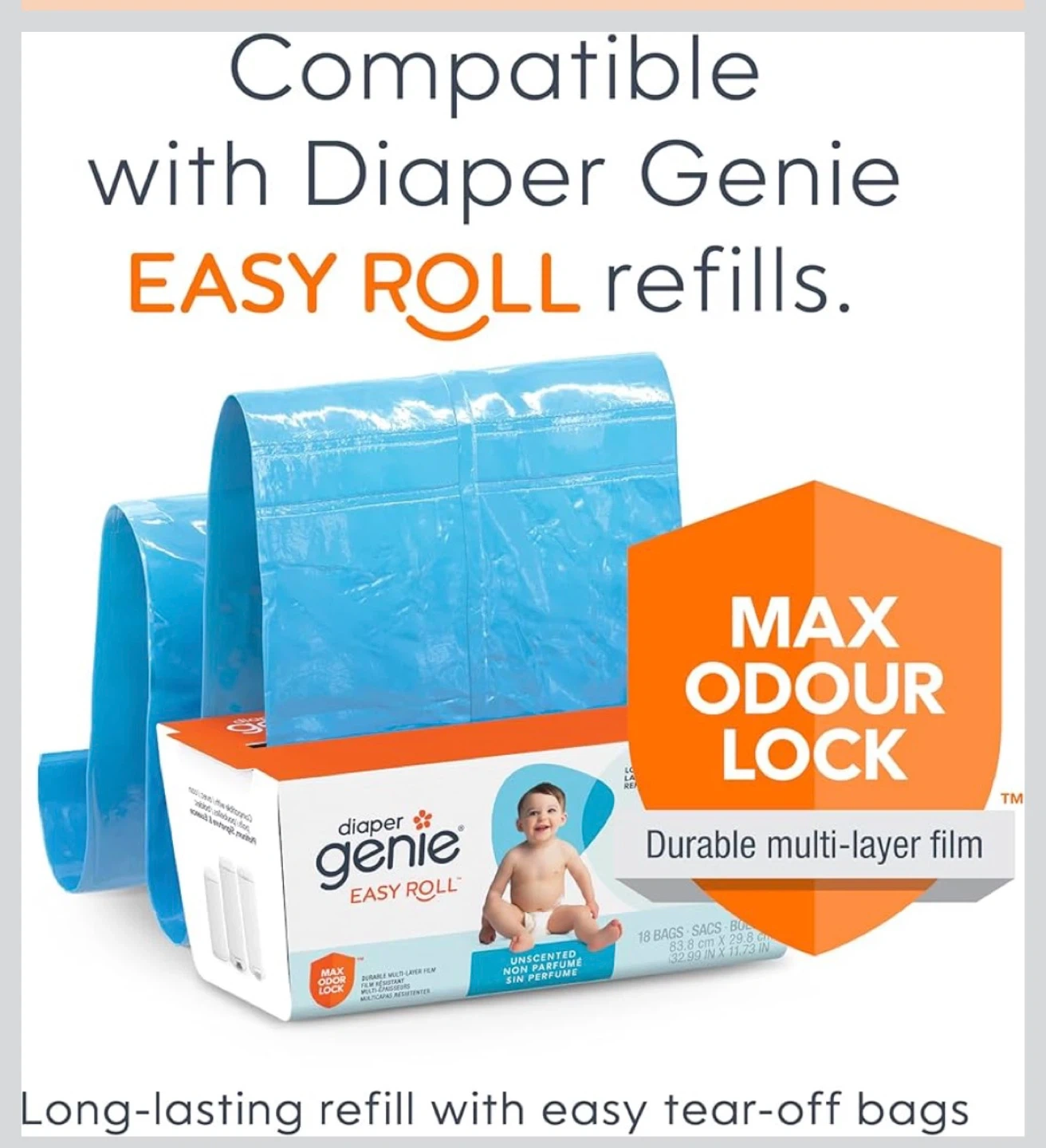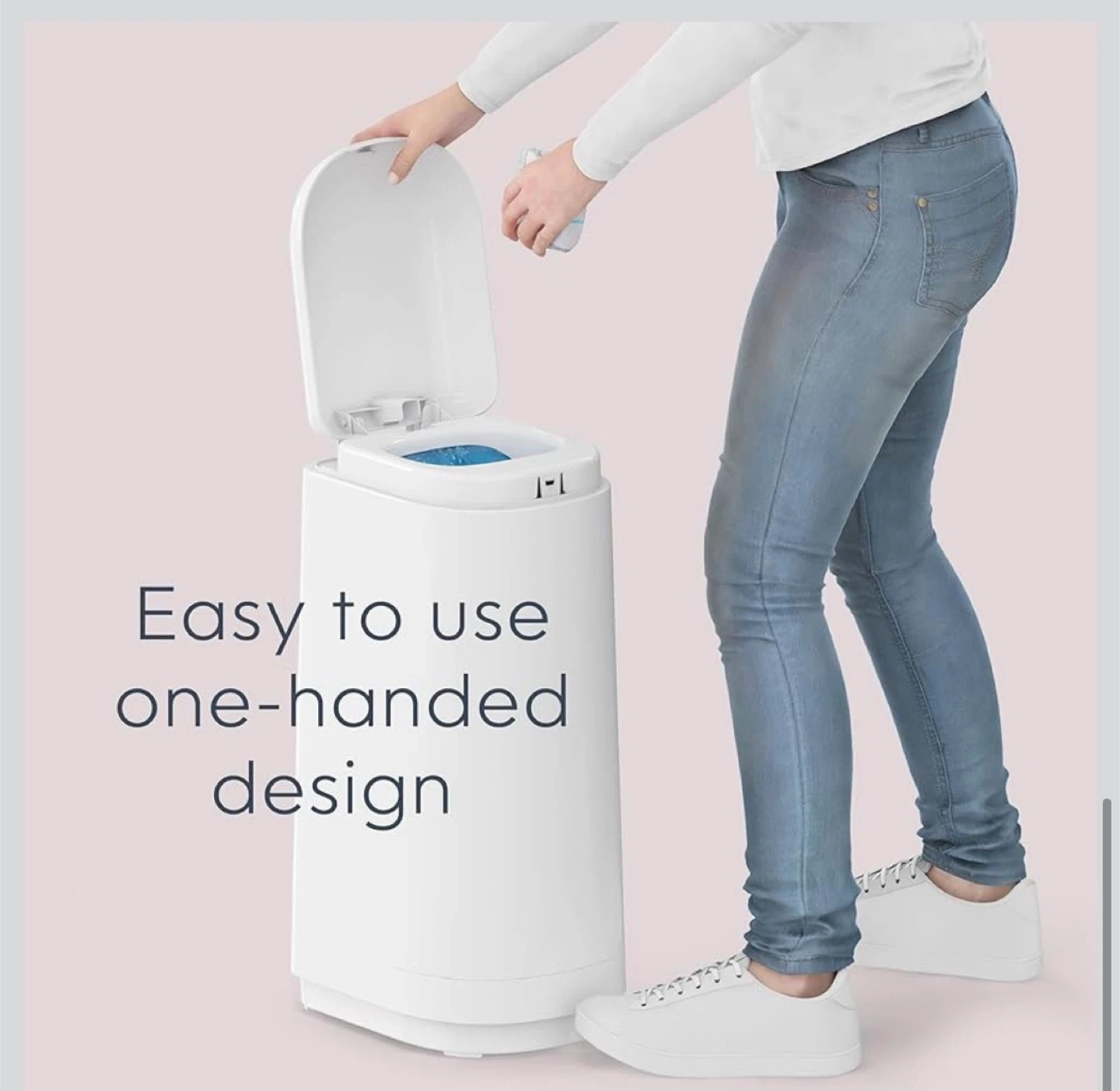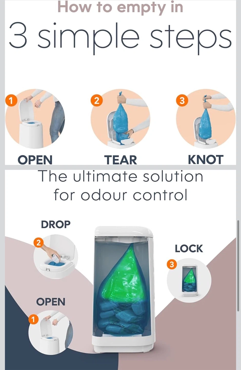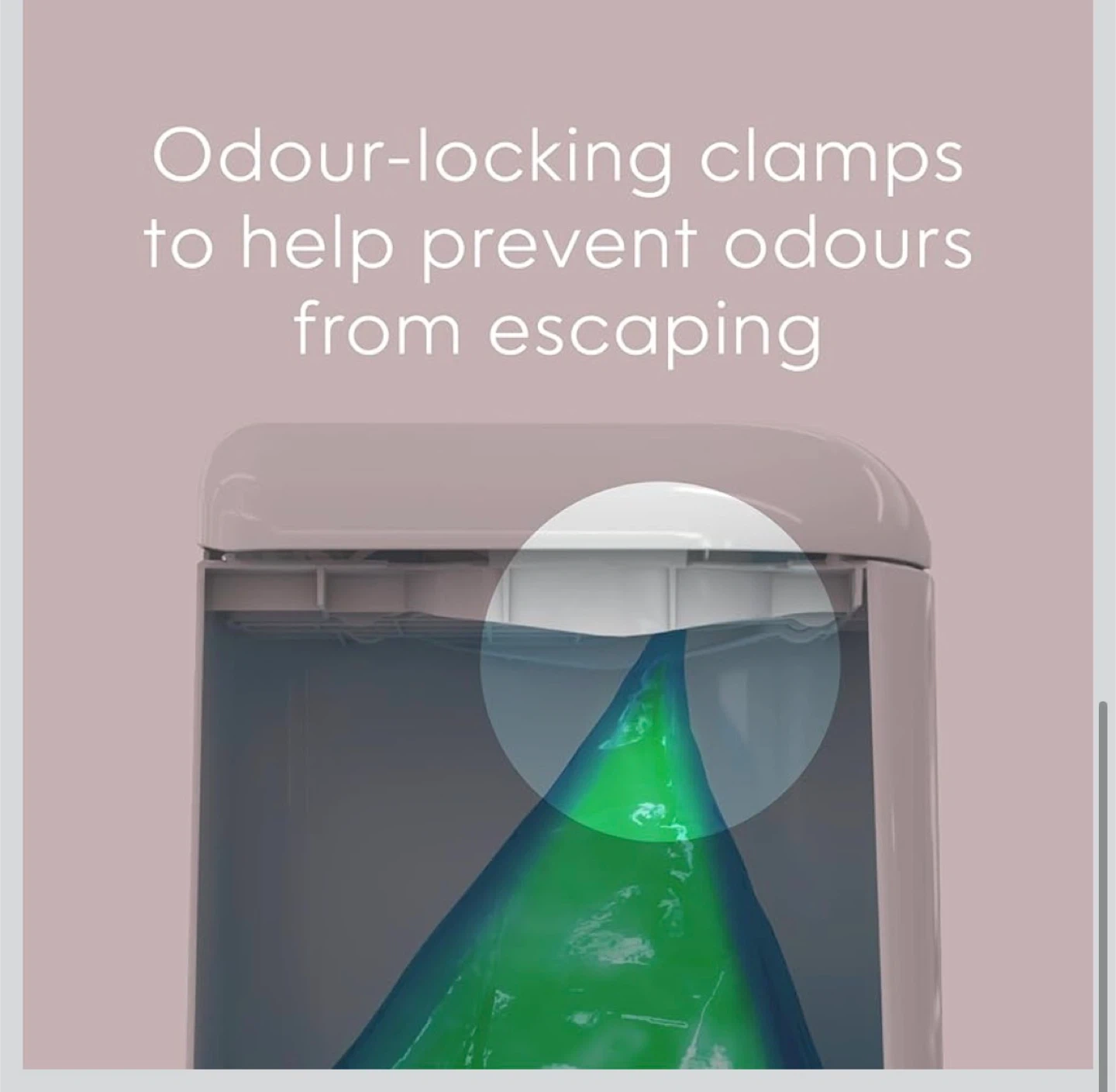 This BabySack diaper pail is white and includes one refill. It features an odour-locking clamp system to help prevent smells from escaping. The pail's high capacity holds up to 40 newborn diapers.