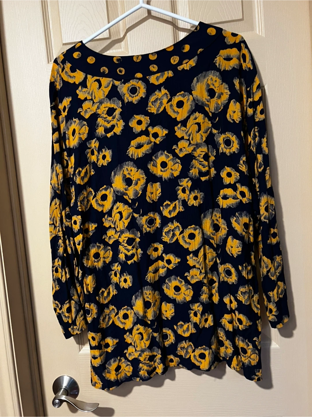 This Carole Little long sleeve blouse and skirt comes in a size large. It features a navy blue background with a bold yellow floral print all over. It's a comfortable and stylish piece for your wardrobe!