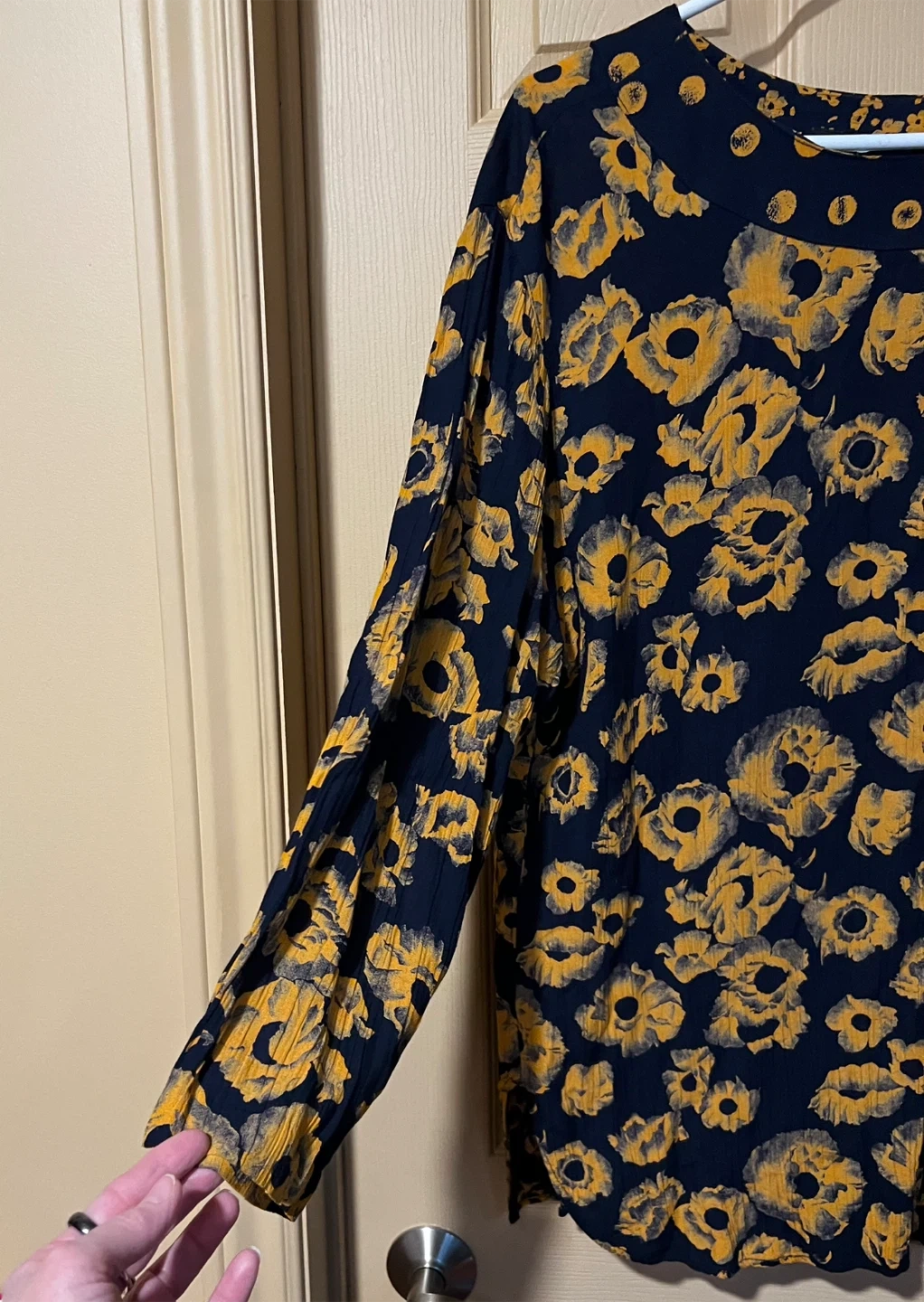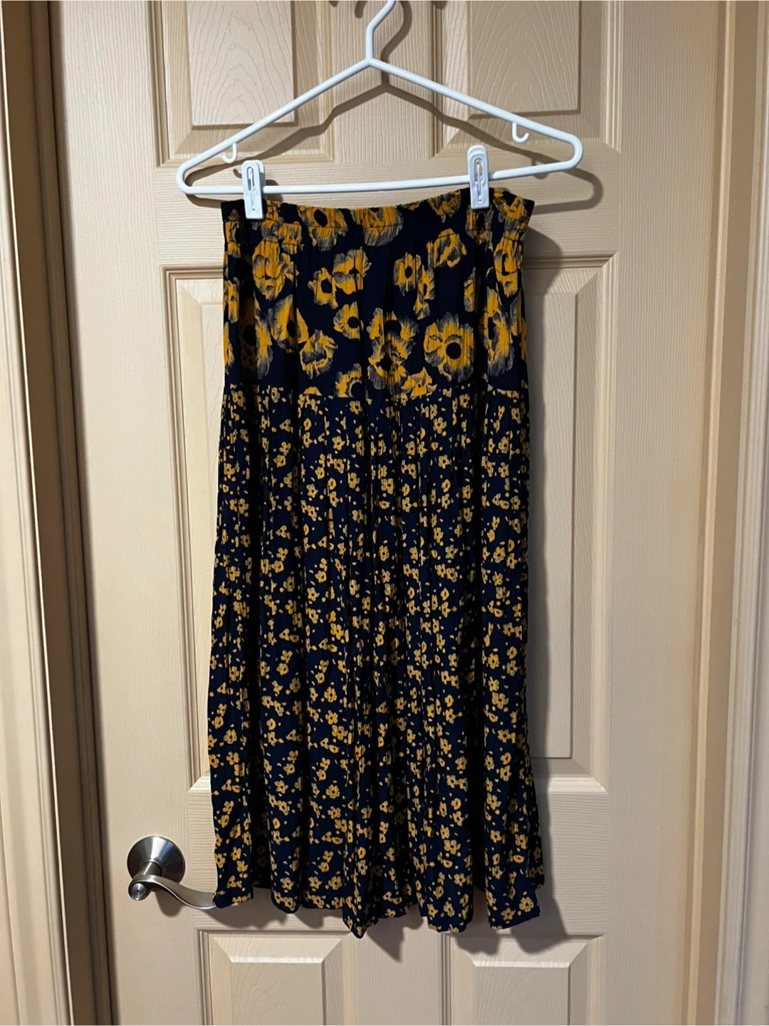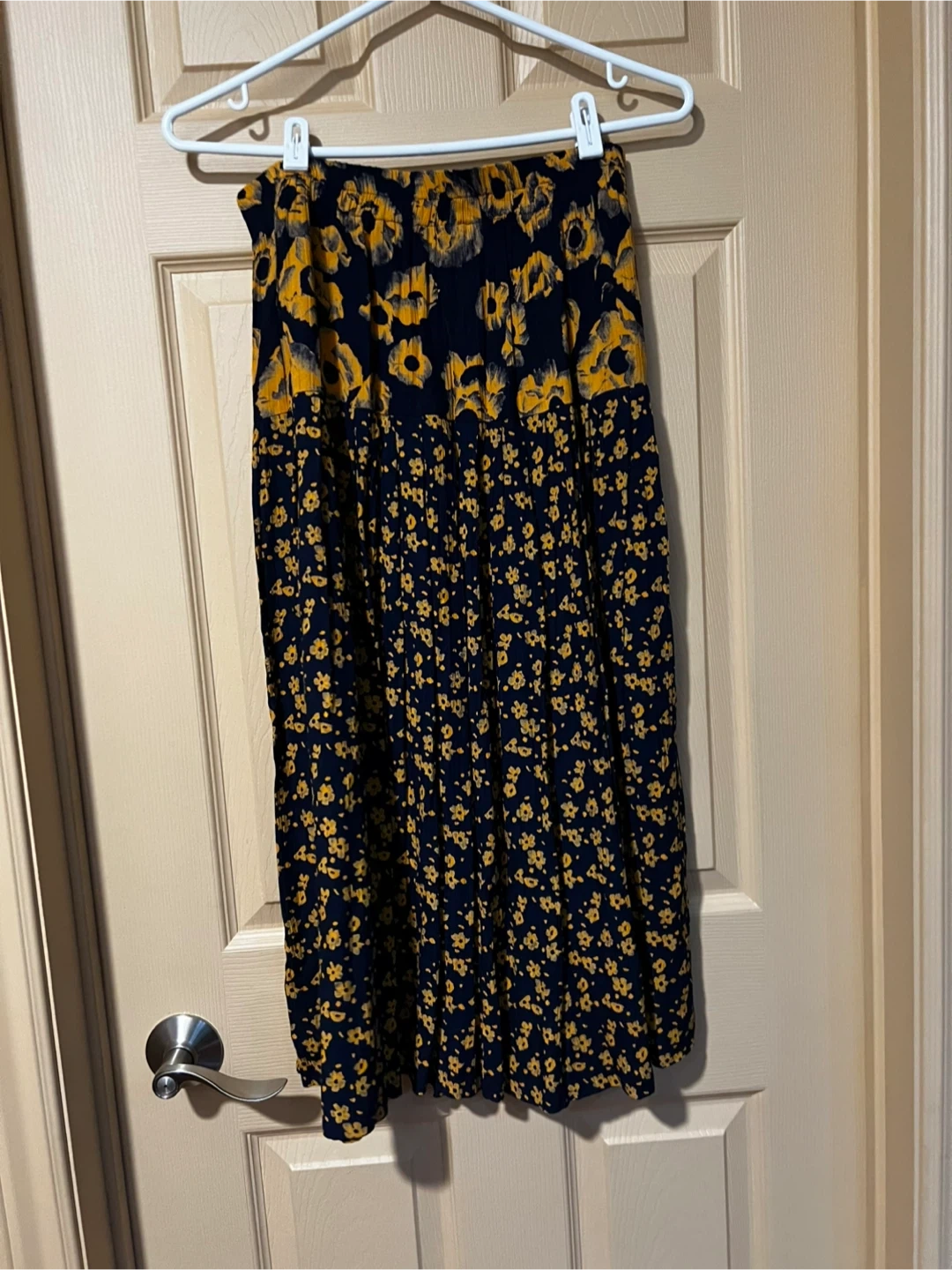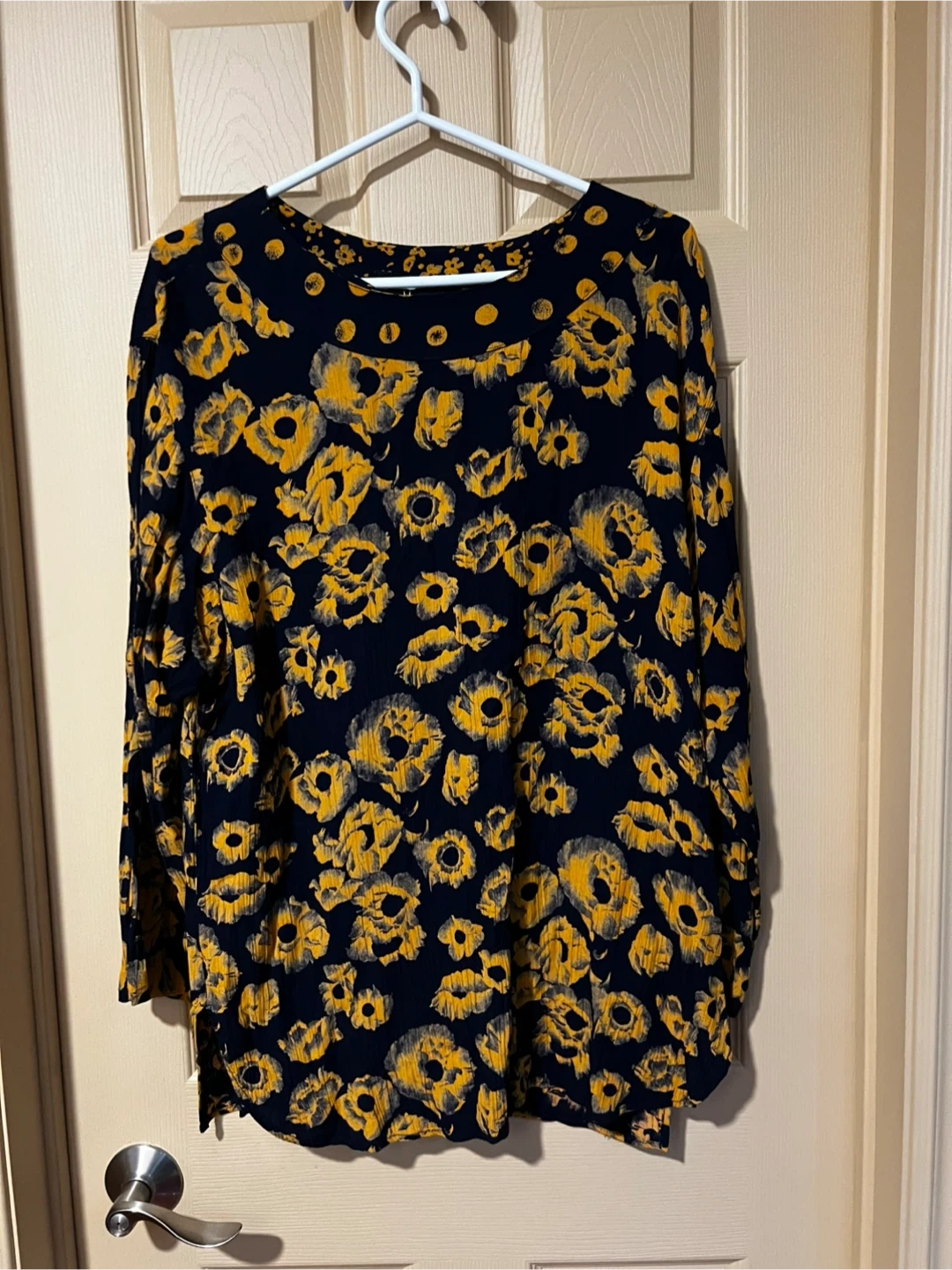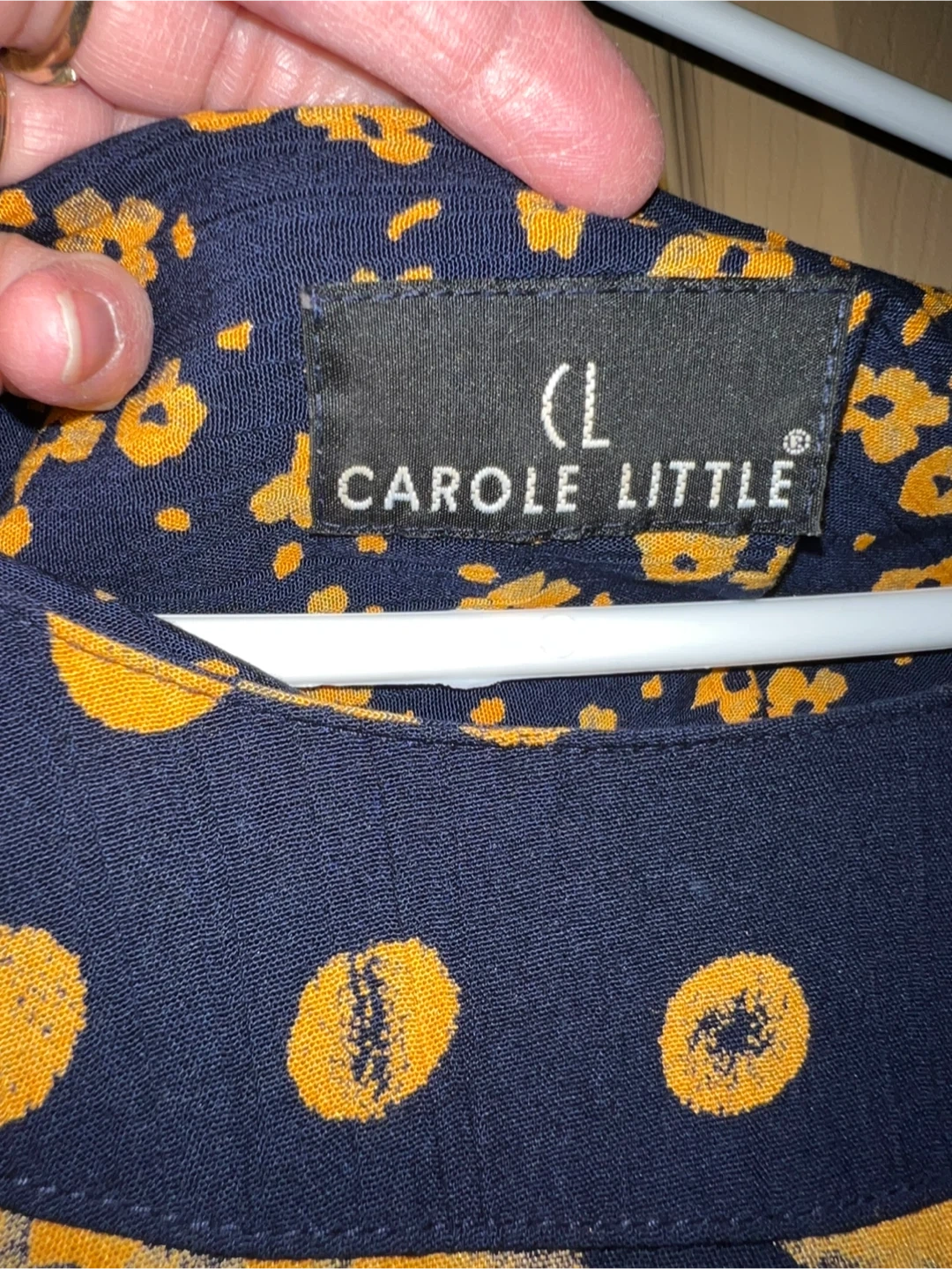 This Carole Little long sleeve blouse and skirt comes in a size large. It features a navy blue background with a bold yellow floral print all over. It's a comfortable and stylish piece for your wardrobe!