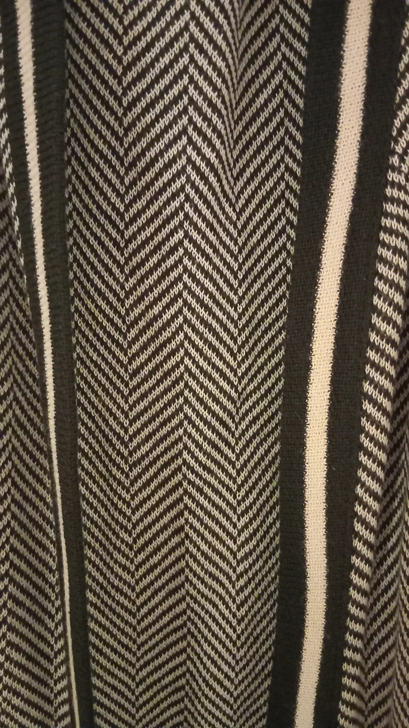 This is a My Way sleeveless open-front cardigan vest. It features a chevron knit pattern with contrasting trim and a geometric hemline. Made in Canada, size medium.