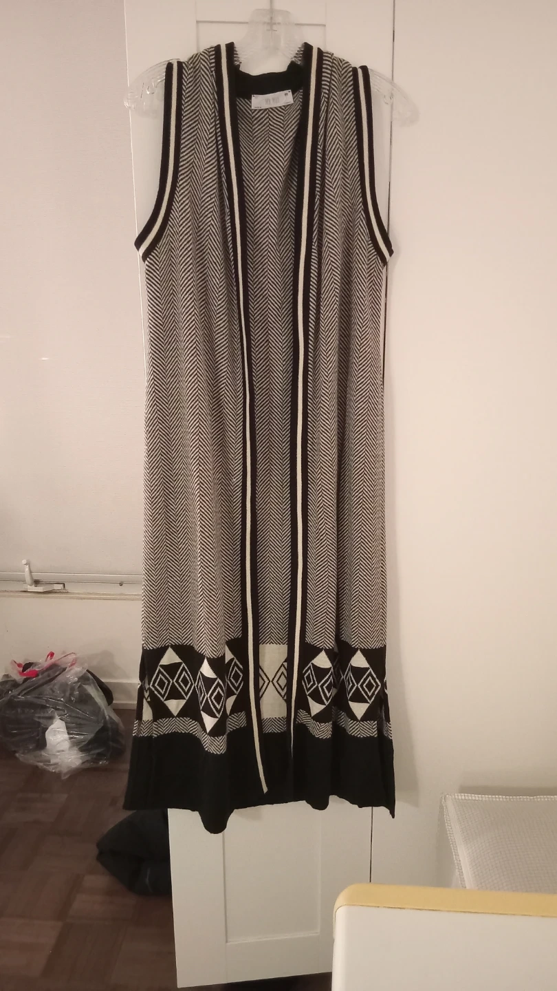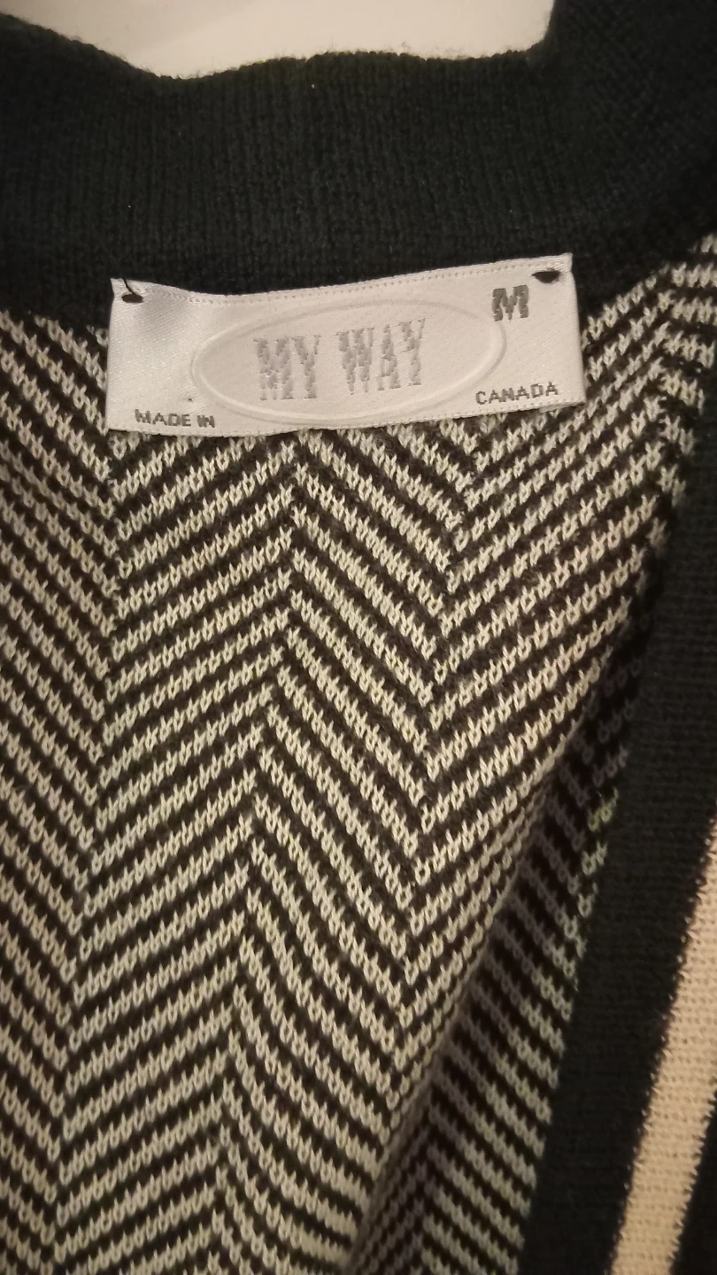 This is a My Way sleeveless open-front cardigan vest. It features a chevron knit pattern with contrasting trim and a geometric hemline. Made in Canada, size medium.