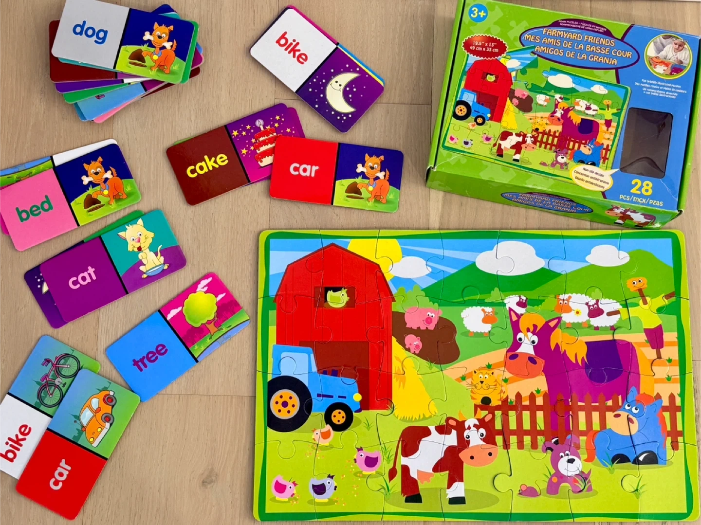 This Farmyard Friends jigsaw puzzle has 28 pieces and measures 49 cm x 33 cm. It's great for young children learning words and animals.