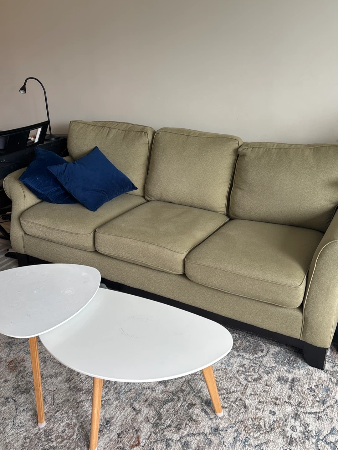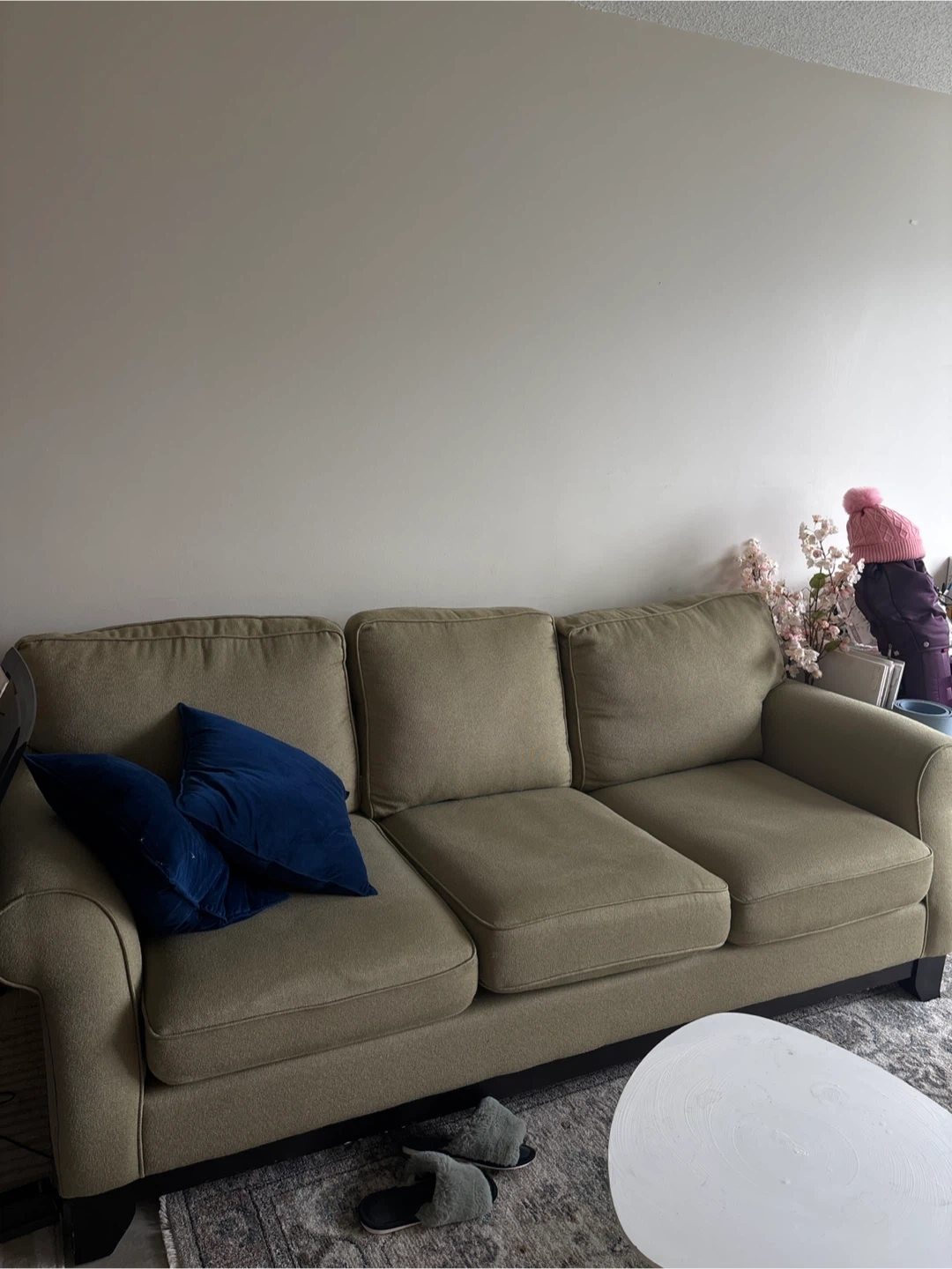 A super comfortable khaki green three-seater sofa. It comes with two plush navy blue velvet throw pillows. Its classic design fits well in most living spaces.
