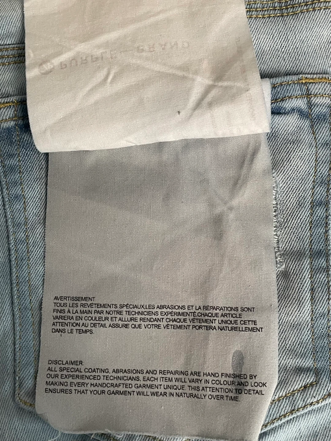 Light wash denim jeans from Purple Brand. They feature a distressed look with rips and paint splatter detailing. These jeans have a dropped fit with slim legs. All coating, abrasions, and repairing are hand finished by experienced technicians.