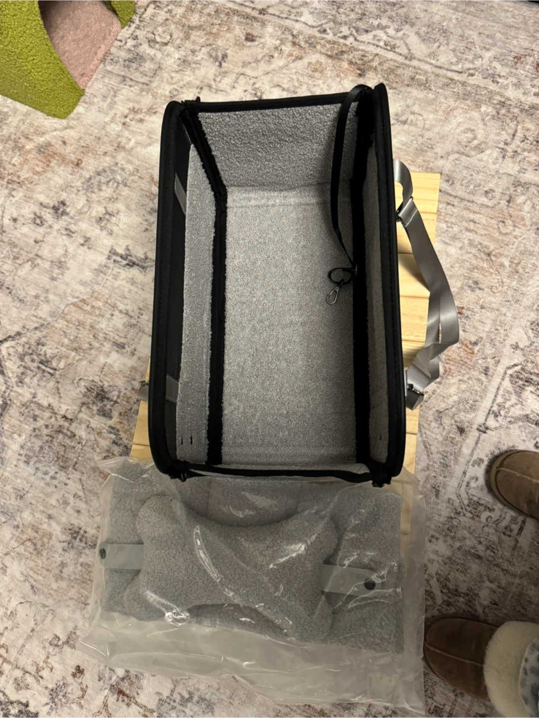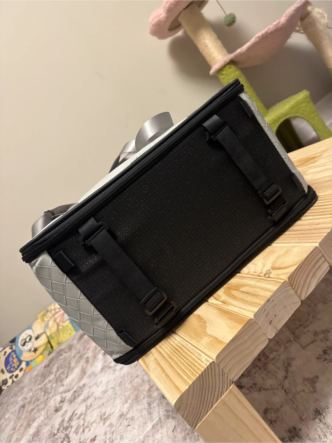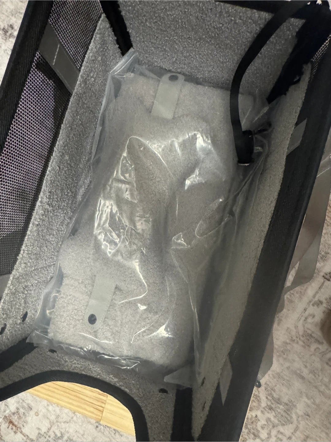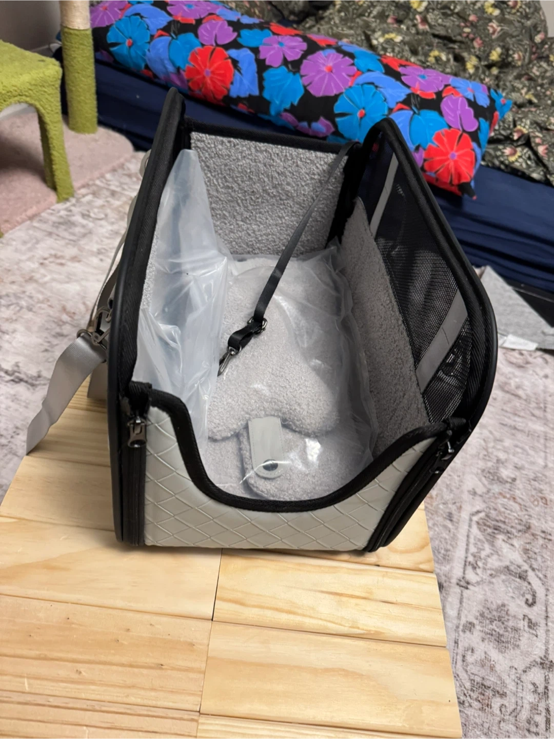 This pet car seat is made with durable mesh panels for ventilation and a grey exterior. It includes a soft, plush lining. Suitable for small pets during travel. Has a place for a leash