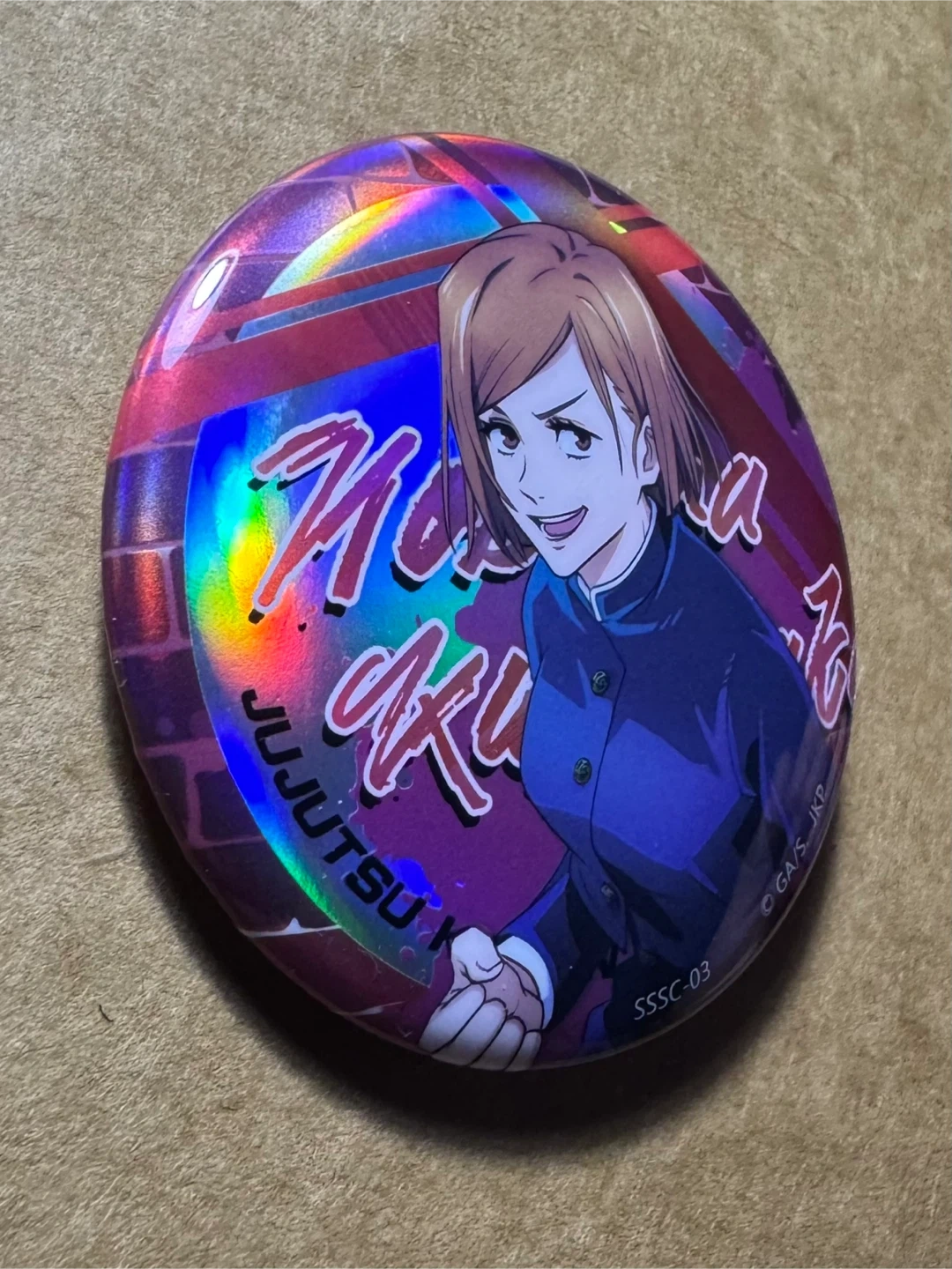 Holographic pin featuring Nobara Kugisaki from Jujutsu Kaisen. It's a round pin with a safety clasp on the back. SSSC-03 model number visible.
