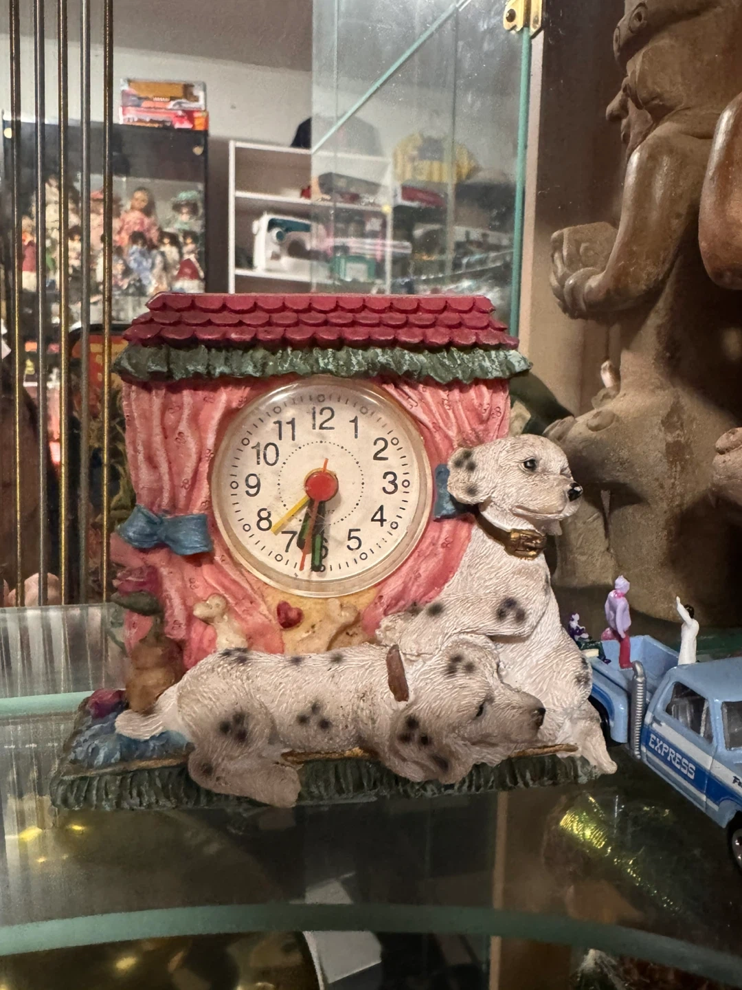 Decorative mantel clock featuring two dalmatian dogs. The clock face has Arabic numerals and a red apple accent. Resin construction with a colorful house-shaped design.