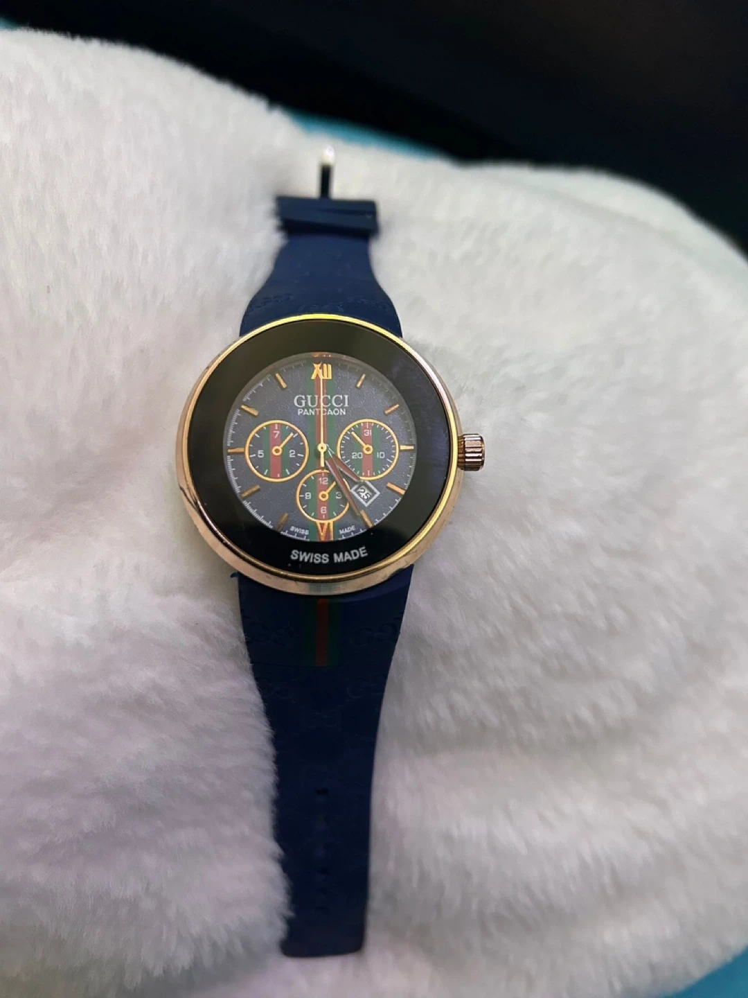 Selling a stylish Gucci watch with a blue band. This watch is Swiss made with a serial number. It's in great condition and ready for a new owner!