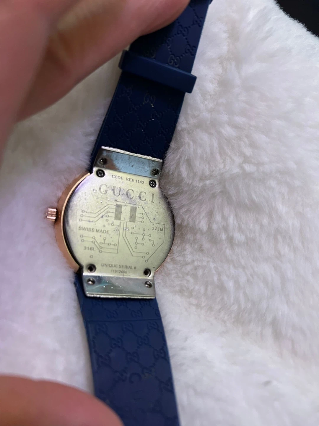 Selling a stylish Gucci watch with a blue band. This watch is Swiss made with a serial number. It's in great condition and ready for a new owner!
