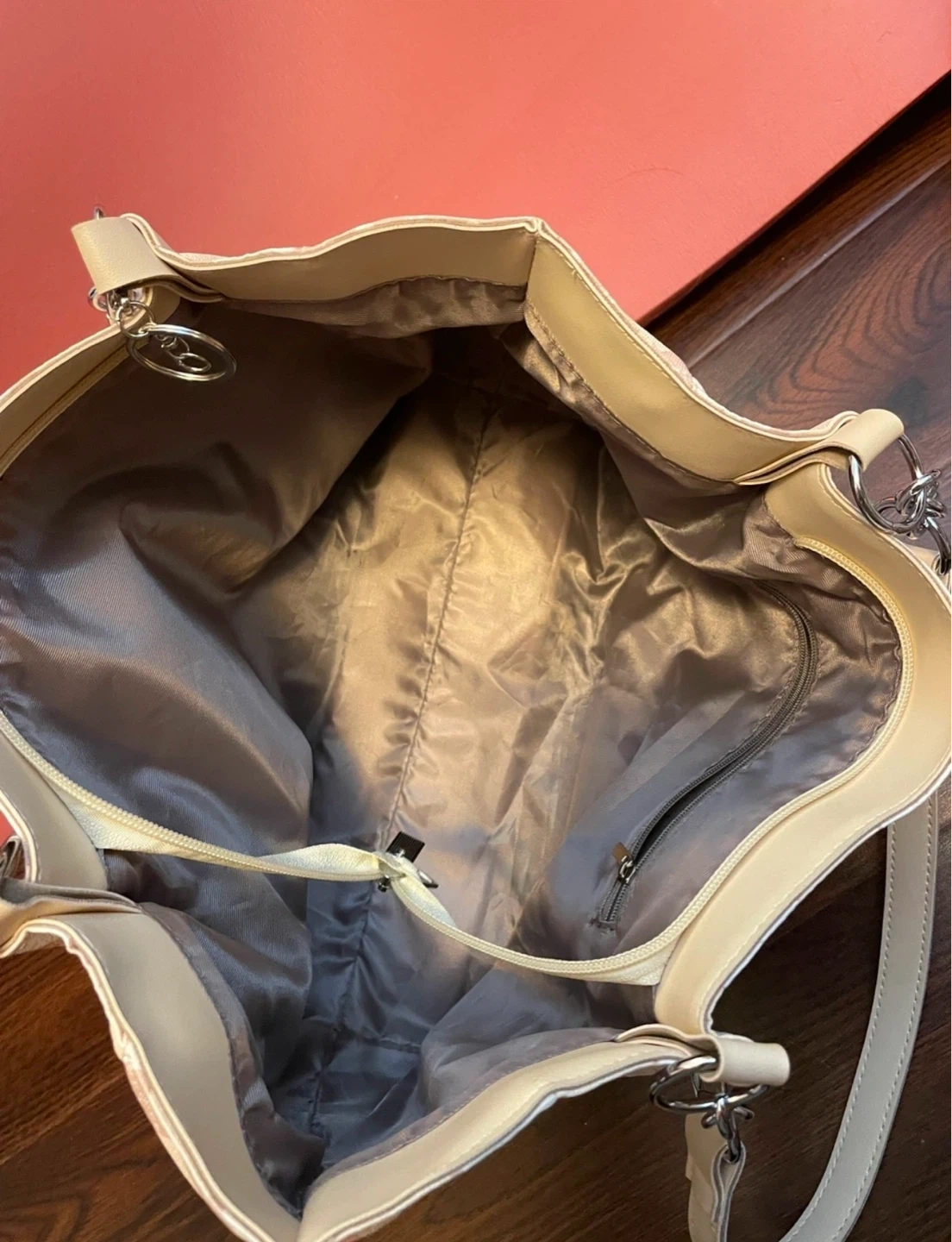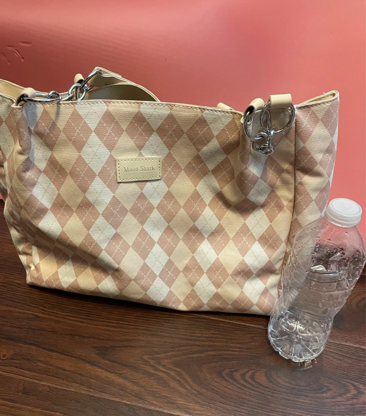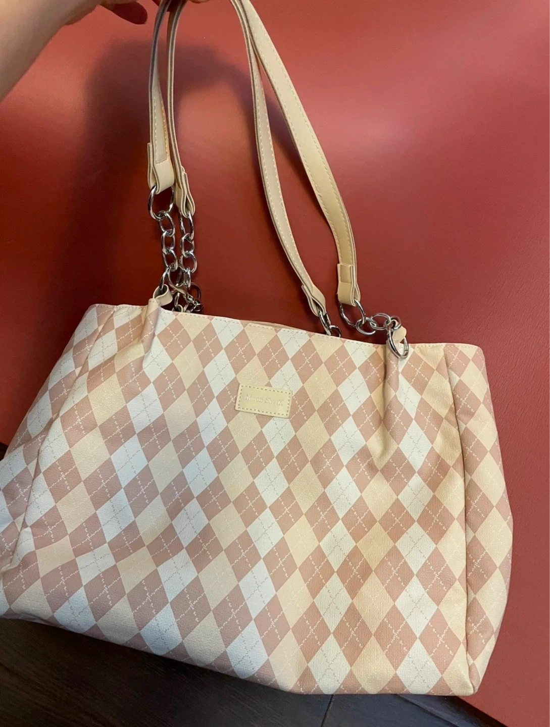 This stylish Muon Shark tote bag features a classic argyle pattern in pink and beige. It has chain and leather shoulder straps for comfortable carrying. The interior is lined with a neutral-toned fabric and includes a zippered pocket.
