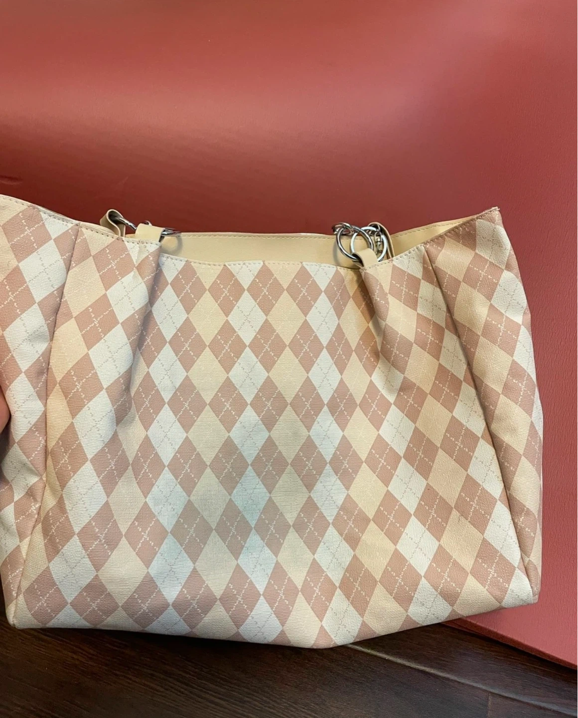 This stylish Muon Shark tote bag features a classic argyle pattern in pink and beige. It has chain and leather shoulder straps for comfortable carrying. The interior is lined with a neutral-toned fabric and includes a zippered pocket.
