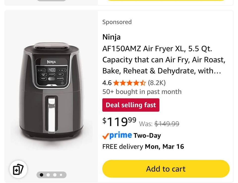 Buy & SellNinja Air Fryer - BRAND NEW Still SealedNinja Air Fryer - BRAND NEW Still Sealed$120Brand new, never opened. I ordered one and received two.WHERE TO MEETCheck LocationView MapSELLERverifiedVicW End600 reviews0 chats·1 favorites·23 viewsSEND CHAT TO SELLERHi Vic! I’m interested in your listing.Hi Vic! I’m interested in your listing.Get the Karrot app to chatSign In to chat