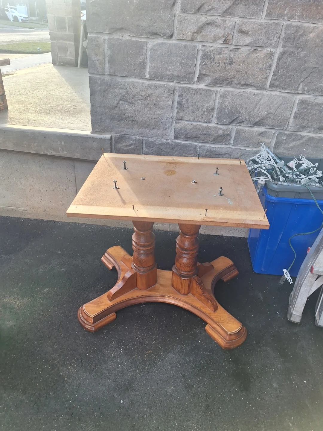 This is a solid wood dining table with a rich wood finish. It's oval-shaped and appears to have extendable leaves, though they are not currently attached. The table has a sturdy pedestal base and shows some signs of wear, but is otherwise in good condition. It's ready for a new home!