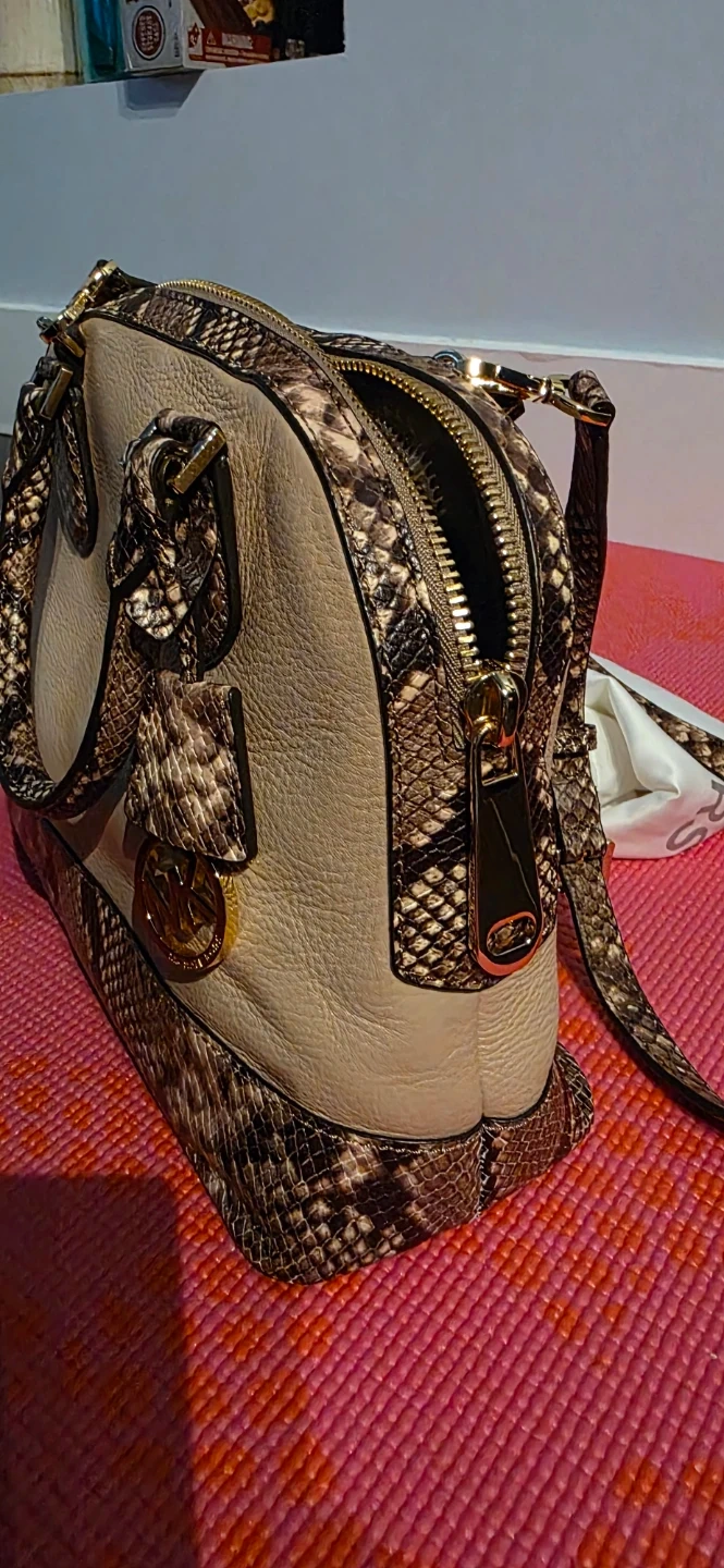 Brand new, Michael Kors dome satchel handbag. It's a beige leather with snakeskin accents. Includes dust bag. This bag is suitable for everyday use or special occasions.