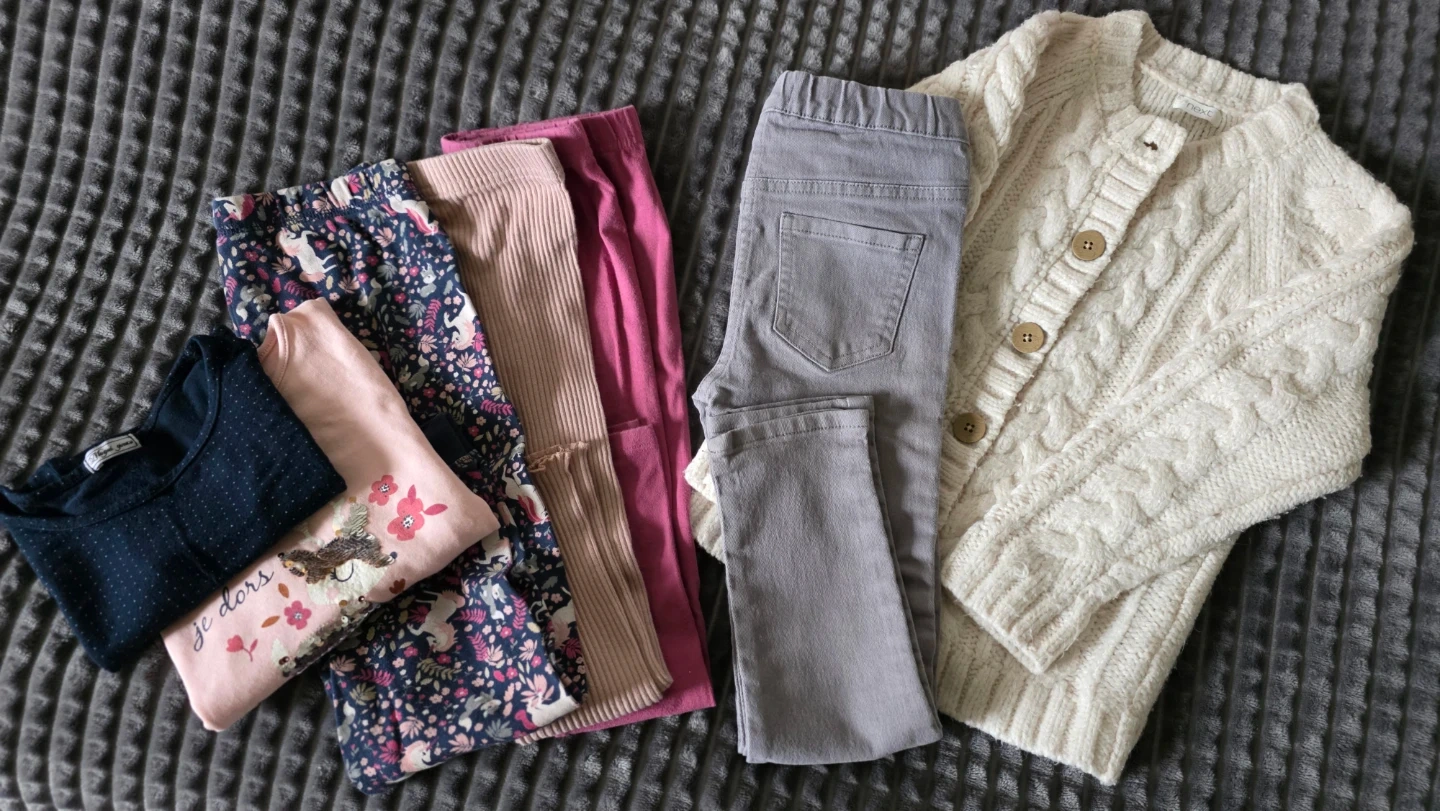 This is a cream cable knit cardigan from Next. It also includes a navy polka dot top, a pink top with a deer graphic, floral print pajama pants, and two pairs of leggings.