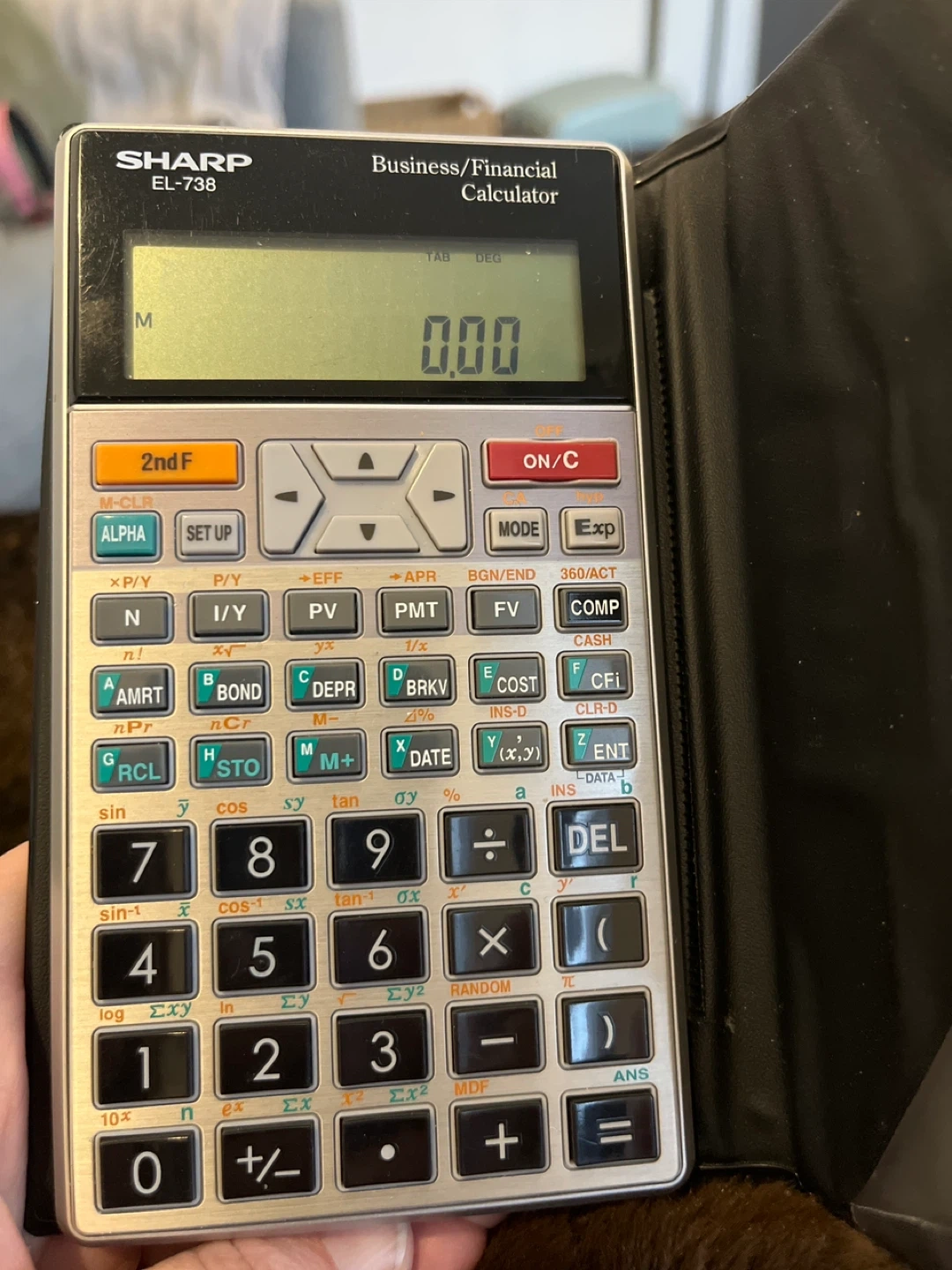 This is a Sharp EL-738 Business/Financial Calculator. It's in good working condition and comes with a protective case. It's great for financial calculations and business needs.